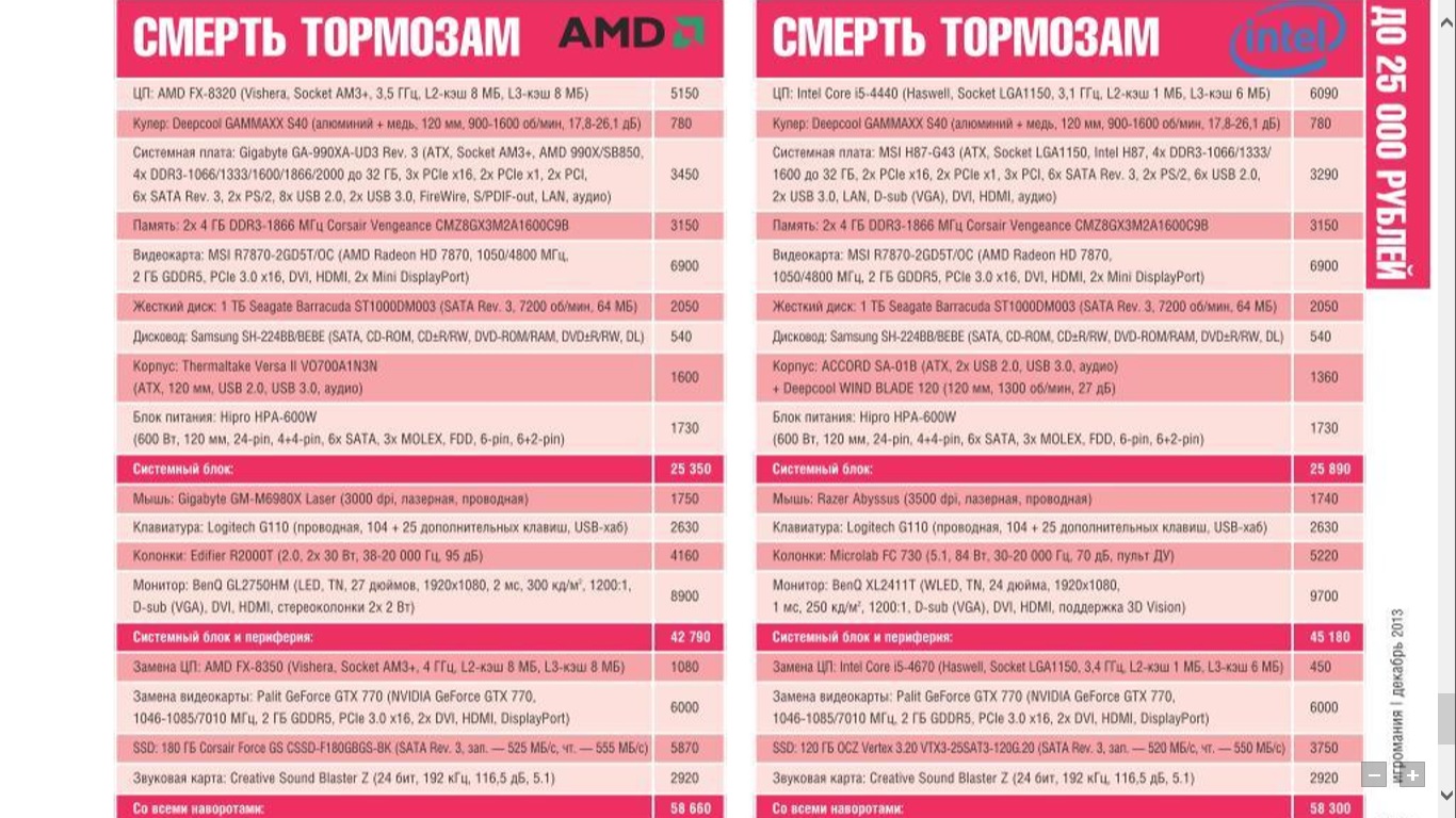 tsobik из Игромании конечно конфиги не всегда плохие но можно и лучше Intel 4770k Msi z87 g55 Hynix 1600mhz 4gb x2 Seagate barracuda 1tb Plextor m5s 128gb Msi tf 780 Cooler master cm690 II advanced Corsair ax860 Thermal right silver arrow sb-e View sonic vp2365 led Sennheiser hd 215 II