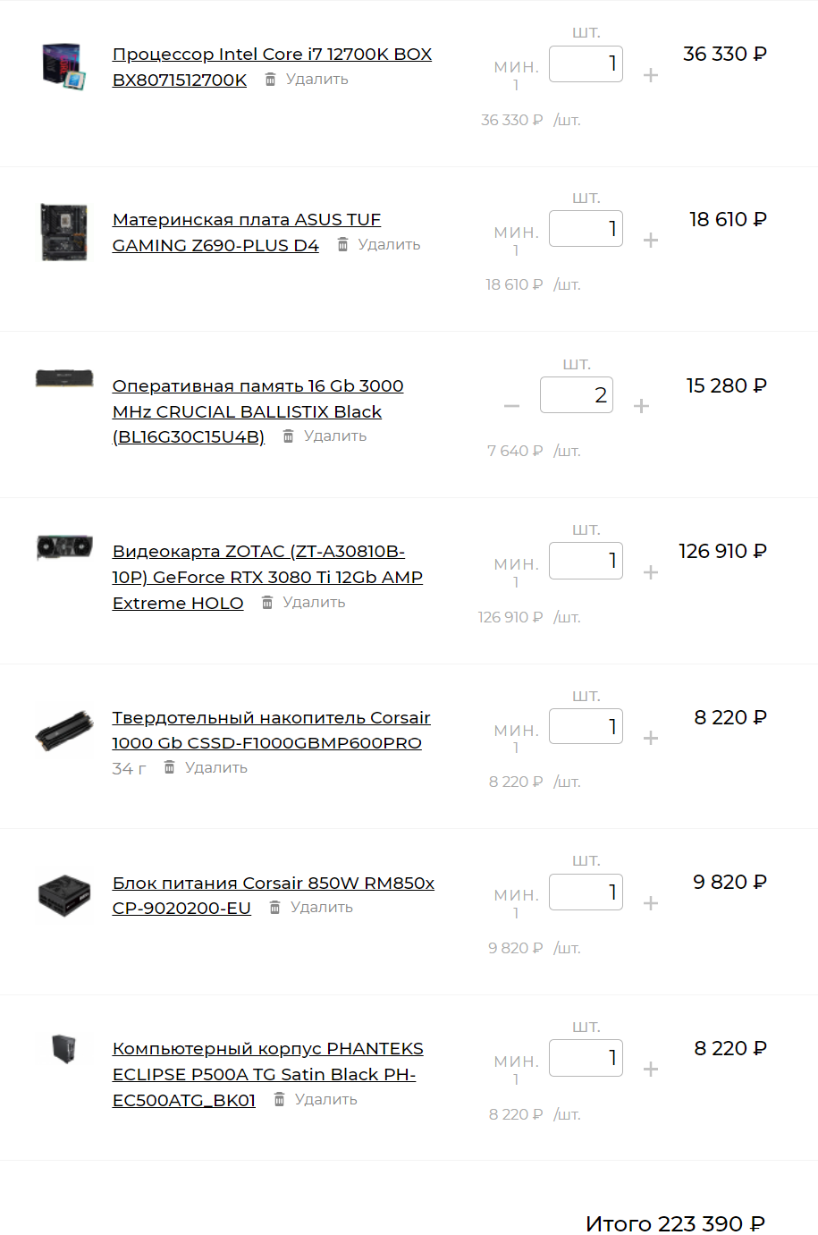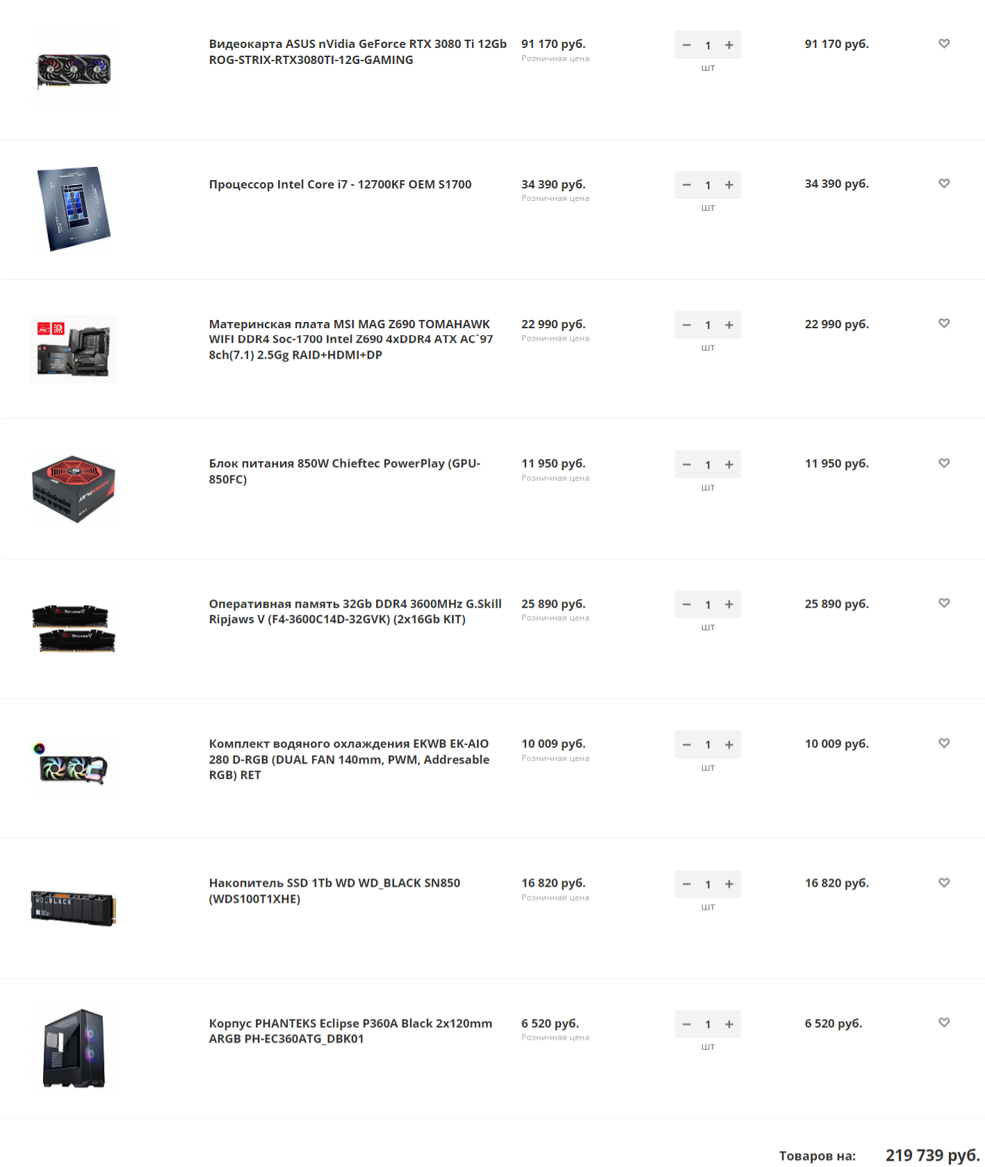 d0bman Конфигурация по Newmart: Процессор Intel Core i7-12700K BOX - 35999р Материнская плата MSI MAG Z690 TORPEDO - 24000р Оперативная память 2х16GB Adata 6400MHz 32GB DDR5-6400 AX5U6400C4016G-DCCARGY - 23750р Система водяного охлаждения Zalman ALPHA 36 Black - 7860р Видеокарта Palit GeForce RTX3080Ti GameRock 12Gb - 102245р SSD 1Tb Netac NV7000 - 9425р Блок питания Deepcool PQ1000M - 11100р Корпус Phanteks Enthoo Pro 2 Satin Tempered Glass - 12870р Итого: 227249р. Корпус если слишком большой или не нравится можно Phanteks Eclipse P500A, но пылевых фильтров нет.