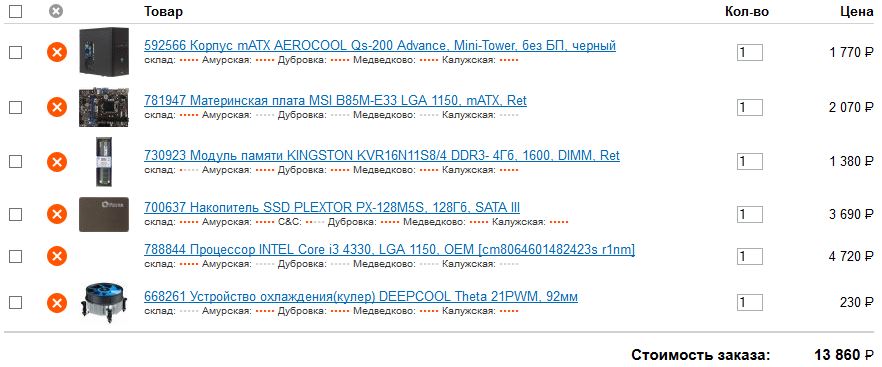 [/quote] http://www.regard.ru/ Регард: 114597 GeForce GTX660 Palit OC PCI-E 2048Mb 121620 Floston Winner 500WATX, mATX, Midi-Tower, 500 Вт 122658 Gigabyte GA-B75M-D2VSocket 1155, Intel B75 106051 4Gb DDR-III 1600MHz Hynix Original 111865 Intel Core i3 - 3240 120742 DeepCool THETA 21 PWM ИТОГО: 15 890 руб. RS. в корпус желательно поставить 120743 Вентилятор для корпуса Cooler Master Silent (R4-S4S-10AK-GP). И ещё, если поискать здесь: http://stolica.ru/pc.htm то возможно уложится в 14.5 т.р. Как пример - http://www.market24.ru/vcd-133-1-162875/GoodsInfo.html Процессор CPU Intel Core i3-3240 = 3719.22 руб. в регарде = 4000 руб. Только корпус с БП желательно не менять, он не самый хороший, но его более чем достаточно и он более мене качественный за эти деньги.[/quote]