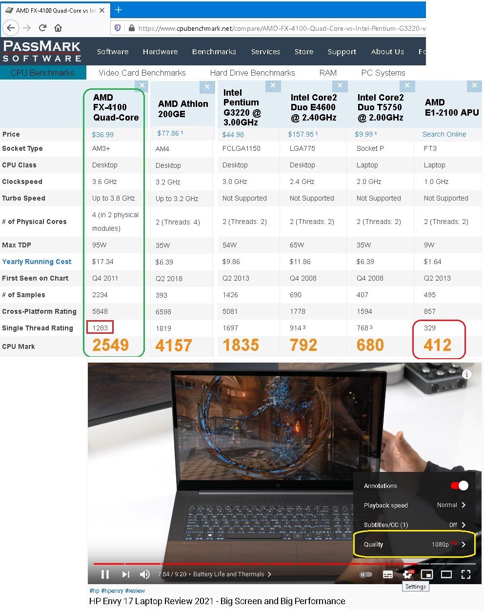 сравнение параметров AMD FX-4100 с Athlon 200GE и др. старыми ЦПУ, и скриншот просмотра Youtube в 1080p на старом Lenovo.