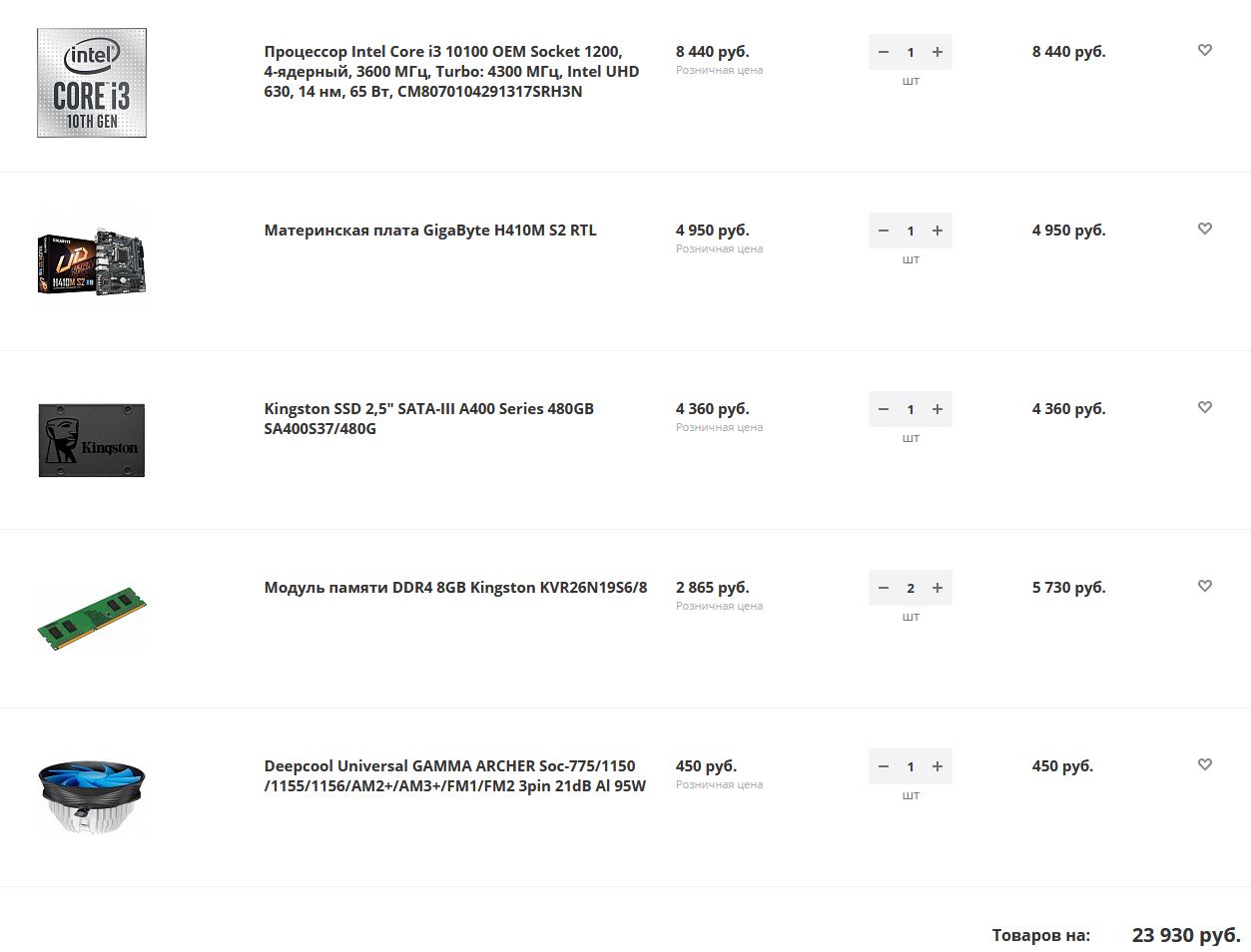 Взял всё максимально дешевое чтобы влезть в бюджет, получилось на 24 тысячи (уже потом понял что ССД можно не учитывать). При желании можно взять оперативную память с более интересными таймингами или материнскую плату получше. Также можно сэкономить пару тысяч на процессоре, взяв i3-10100F (без видеоядра), если на руках имеется хоть какая-то видеокарта.