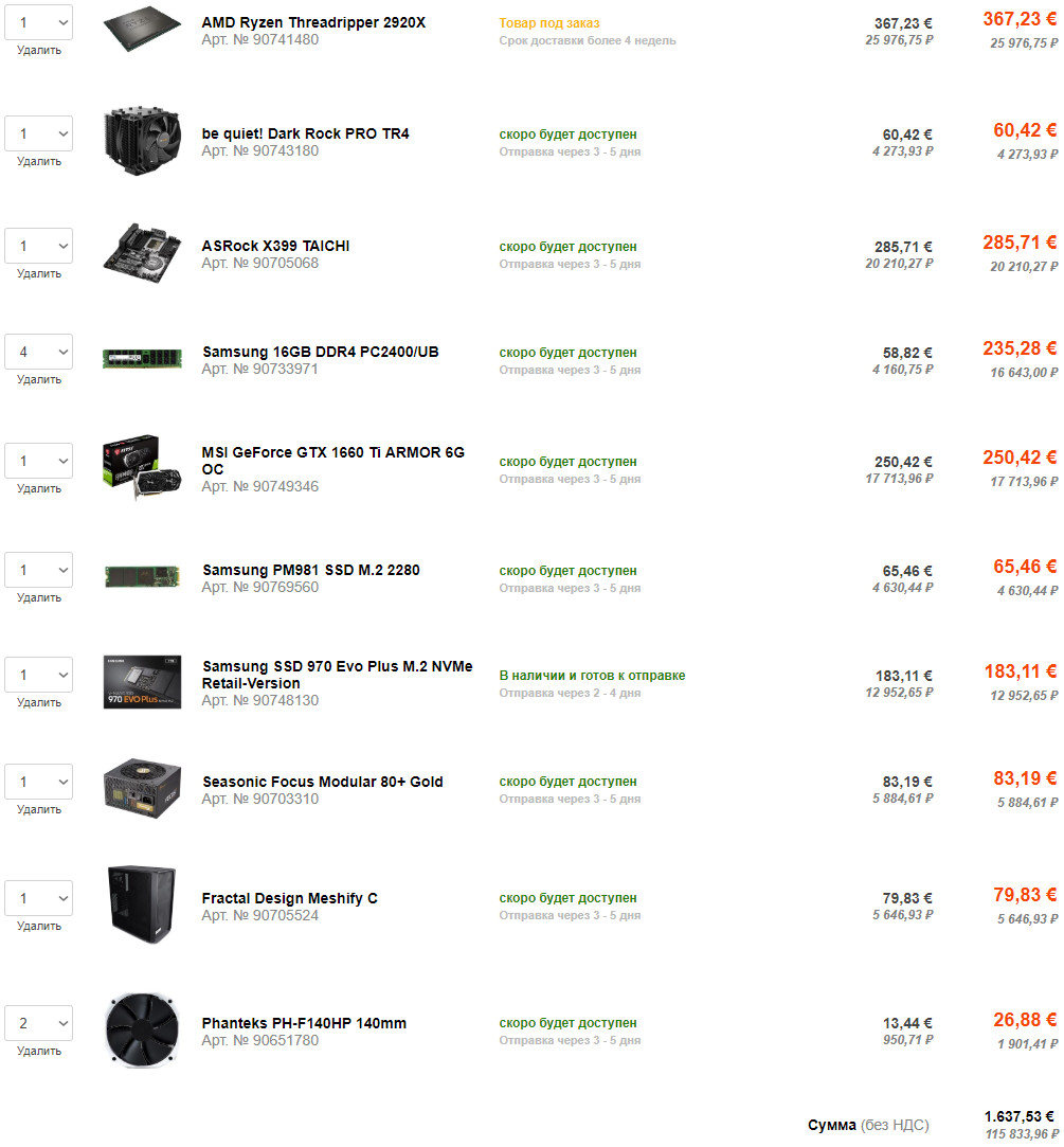 Приветствую! 1. До 100тр 2. СПб 3. МВ+CPU+память 4. 3D - Houdini: симуляции, рендер и тд. 5. Разгон будет 6. Апгрейд не планируется, только если докупить что. 8. Память - 128GB. Скорость CPU важна как в однопоточных задачах, так и в многопоточных. OS - linux (Centos, debian) 9. i7 7820X + MSI X299 RAIDER + 128GB (8 * SAMSUNG M378A2K43CB1-CTD)
