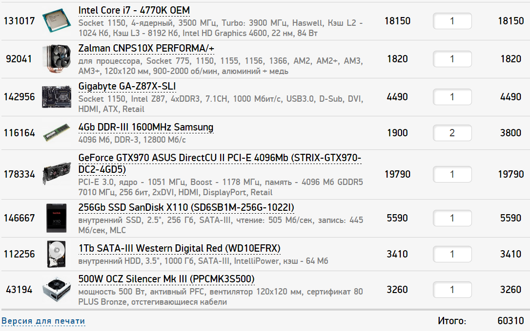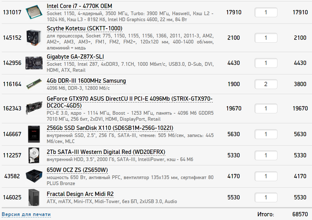 См. конфиг, который я предложил тут Ветка выбора компьютера до 70.000 рублей. #12879129 (с заменой 4670K на 4770K/4790K OEM). В Вашем варианте переплата за ССД, проц, БП. Материнка посредственная, памяти достаточно (на первое время - лет на пять) 2x4Gb, корпус не самый оптимальный. Вариант, предложенный Noveon, тоже хорош.
