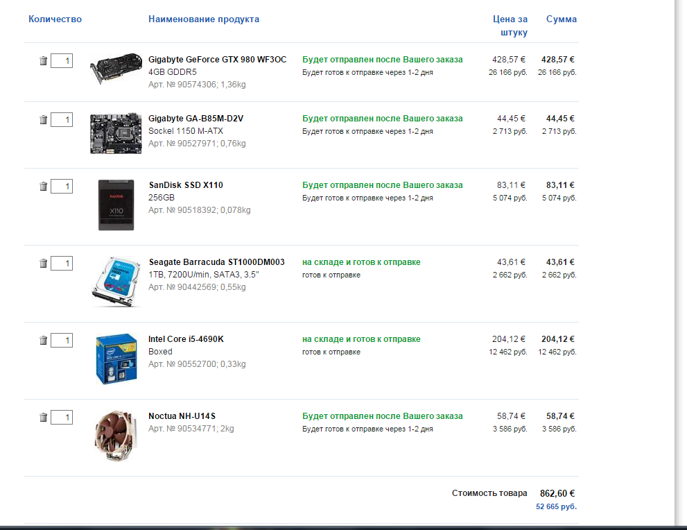 9) Наброски конфигурации ПК в сумме выходит (1162.50 €):