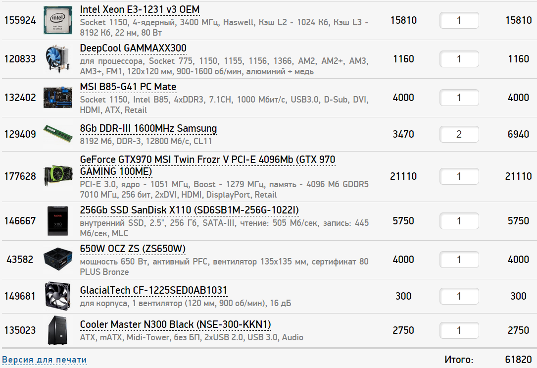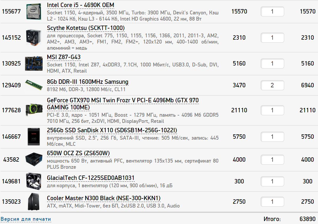 1. 70k 2. http://www.computermarket.ru/, Санкт-Петербург. Возмжно есть магазины лучше, но тут нашел практически все, что предполагаю купить. 3. Только системник 4. Игры, веб-серфинг, офисные задачи. Разрешение монитора не помню, он довольно старый. Вроде бы 1920х1200, точно не 4к и т.д. Игры типа Skyrim, Fallout NV (Fallout 4), Dota2 на максимальных настройках. 5. Разгон не планирую. 6. Апгрейд не планирую. 7. Дополнительного железа нет. 8. Низкий уровень шума. 9. По прайсу магазина получается 66258 руб. Процессор INTEL CPU Core i5 4690 Haswell Refresh OEM OEM Вентилятор ZALMAN Cooler CNPS10X Performa (изначально хотел от Noctua, но в магазине их не оказалось совсем) Материнская плата Gigabyte GA-H97-D3H RTL Видеокарта MicroStar MSI GTX960 GAMING 2G GDDR5 128BIT / GTX 960 GAMING 2G / RTL Корпус Fractal Design Define R4 Black Pearl Window side panel [FD-CA-DEF-R4-BL-W] Блок питания Chiefitec Chieftec PSU GPS-500C BOX 500W Smart ATX2.3 Cable man w/ oFan Plat Модуль памяти Kingston DDR3 DIMM 16GB PC3-12800 1600MHz Kit 2 x 8GB HX316C9SRK2/ 16 HyperX Savage Series CL9 Жесткий диск WESTERN DIGITAL 1TB WD Caviar Green WD10EZRX накопитель SanDisk SSD 240Gb Ultra II SDSSDHII-240G-G25