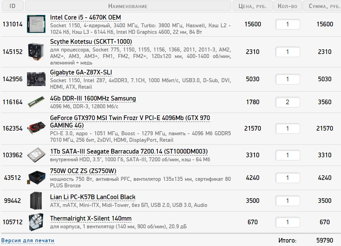 Здравсвтуйте, выбираю себе новый системник, прошу подсобить знающих людей 1) 70к 2) Москва - http://www.citilink.ru/, http://www.regard.ru/, http://www.ulmart.ru/ 3) Системник 4) Игры, программирование 5) 1920-1200 (настройки желательно максимально возможные в играх) Witcher 3, Dragon Age Inqusition, Fallout 4, DOOM + Oculus rift ну и плюс запас на новинки 5) Разгон не планируется 6) Возможно, обсуждается отдельно. Если вливания и будут, то, скорее всего только SLI. Хотя если умельцы посоветуют что-то другое по апгрейду, буду рад выслушать 7) Железа нет 8) Intel + nVidia, корпус черный, можно с подствекой (синяя/красная). Шум - не критично (ествественно не самолет) 9) Набросков нет, глаза рабегаются А вообще i5 4690 + GTX 970 (Asus strix / Gigabyte) из первоначальных набросков