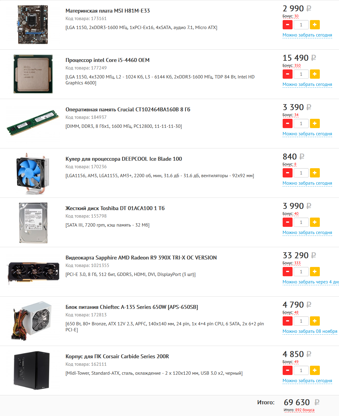 Материнская плата:MSI B85M-E45 Процессор:Intel Core i5-4460 Материнская плата GIGABYTE GV-N970IXOC-4GD, GTX 970, 4096МБ кулер Cooler Master CP6-9HDSA-PL-GP Модуль памяти Kingston HX316C10F*K2/8 Блок питания Corsair CX600M 600W ---дорого возможно менять Корпус Zalman ZM-T4 Black SSD Plextor PX-128M6S HDD SEAGATE Barracuda ST1000DM003 Пока такой думаю. Но бюджет ровно 60 тысяч( И лучше чтобы было дешевле нежели в одном магазине.