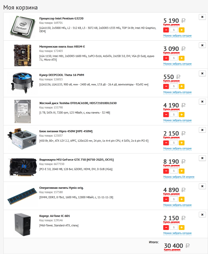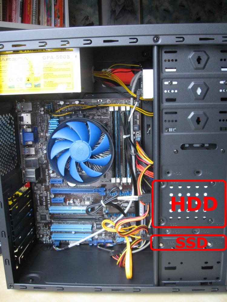 kilwatt Интант: 1. Процессор Intel "Celeron G1840" = 2 398 р. 2. Кулер для процессора DeepCool "THETA 115" = 219 р. 3. Материнская плата ASRock Socket-1150 "H81M-HDS" = 2 754 р. 4. Модуль памяти Crucial 4ГБ DDR3 SDRAM "CT51264BA160B" 2 081 р. x 2 шт. = 4 162 р. 5. Накопитель SSD Smartbuy 120ГБ "Ignition 2" SB120GB-IGNT-25SAT3 = 3 518 р. 6. Накопитель HDD Hitachi 500ГБ 2.5" Travelstar Z7K500 "HTS725050A7E630" = 2 682 р. 7. Блок питания FSP 400Вт "400-60HCN" = 1 629 р. 8. Корпус ACCORD Midi-Tower "P-28B" = 1 302 р. 9. Вентилятор для корпуса Cooler Master "NCR-12K1-GP" = 175 р. К оплате: 18 839 руб. HDD установите вертикально, а SSD - горизонтально, чуть ниже. Смотрите на фото: