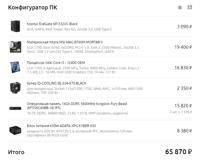 Вроде помещается в бюджет. Прошлый сиcтемник, который я ему задарил 10 лет назад на Intel Q9550, перестал радовать быстродействием в этих задачах, хотя худо-бедно по ютубу и браузеру лазает. Принято решение обновиться. И теперь собственно вопрос. Сборка на основе 12400 тянет на бюджет ~70к. Принимая во внимание его не особо нагруженные задачи, есть мысль взять с авито комплект на b550+5600(x)+32гб ддр4. С учетом имеющегося ссд и если доставить ему еще на 1тб, все будет летать. В игры он не играет и не планирует, для фотошопа и лайтрума я ему подкину 2060/6гб, ее просто за глаза даже для плагинов топаза. На итого по прикидкам в таком варианте удастся уложится в ~50к.
