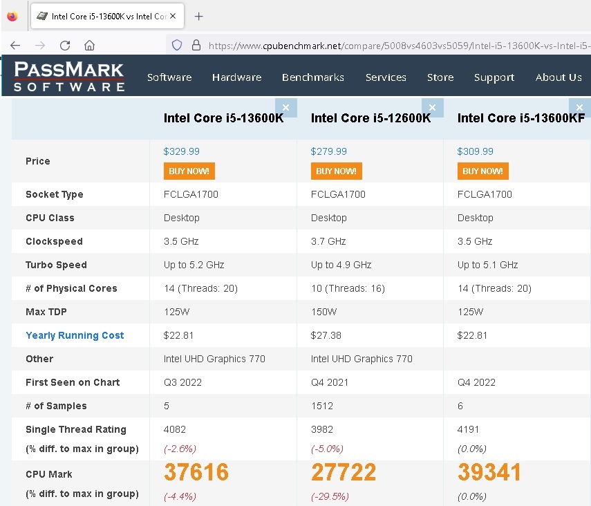В ваших краях должно быть скоро будет в продаже Core i5-13600K. Который у нас лишь на пару бутылок самого дешёвого вина дороже чем Intel Core i5-12600K. Зато Intel Core i5-13600K несомненно шустрее. И также уже в продаже Core i5-13600KF который очень даже неплох, хотя лишь слегка (на несколько $$) дороже чем Core i5-12600K.