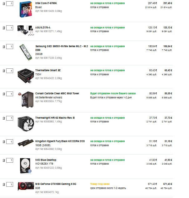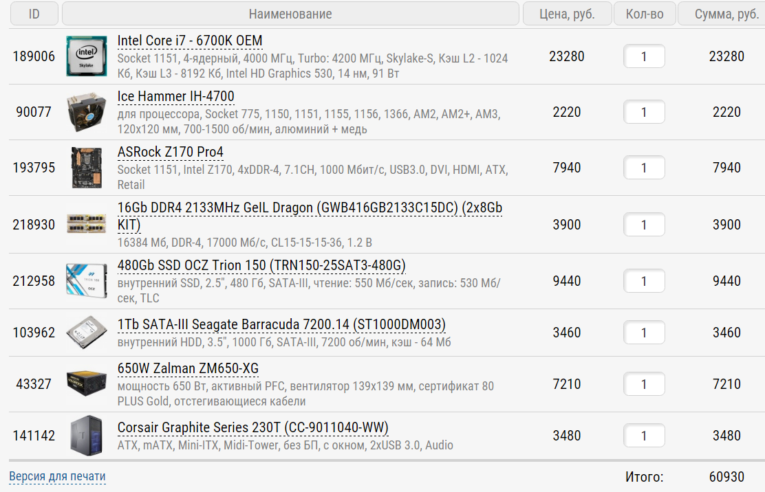 Обратите внимание на прежлагаемые мной конфиги. Если максимально дешево, то примерно так: 6700K + MSI Z170-A Pro + 8Gb Samsung x2 или комплект 2x8Gb 3200Mhz Geil + Gammaxx 400 или (лучше) IH-4700 + Trion 150 960Gb (если точно нужен ССД такого объема) + Chieftec CPS-650S или Corsair CS550M или (лучше) Corsair RM550x/650x + Zalman R1 + 1070-ая или 1080-ая. За что-то переплачивать стоит при наличии особых специфических требований к компу (см опросник https://forums.overclockers.ru/viewtopi ... 6#p4743466 - вообще хорошо бы его было заполнить).