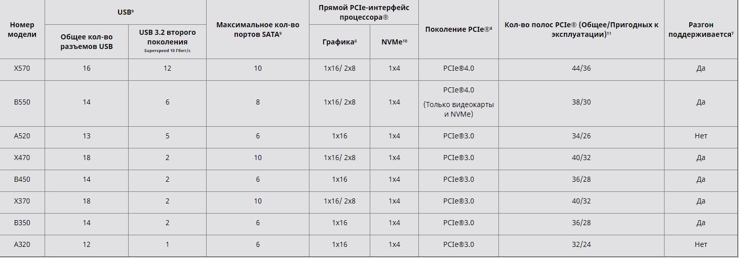 Если мы говорим про AMD, то на данный момент эта компания выпускает следующие чипсеты: A320, B350, X370, B450, X470, A520, B550, X570.