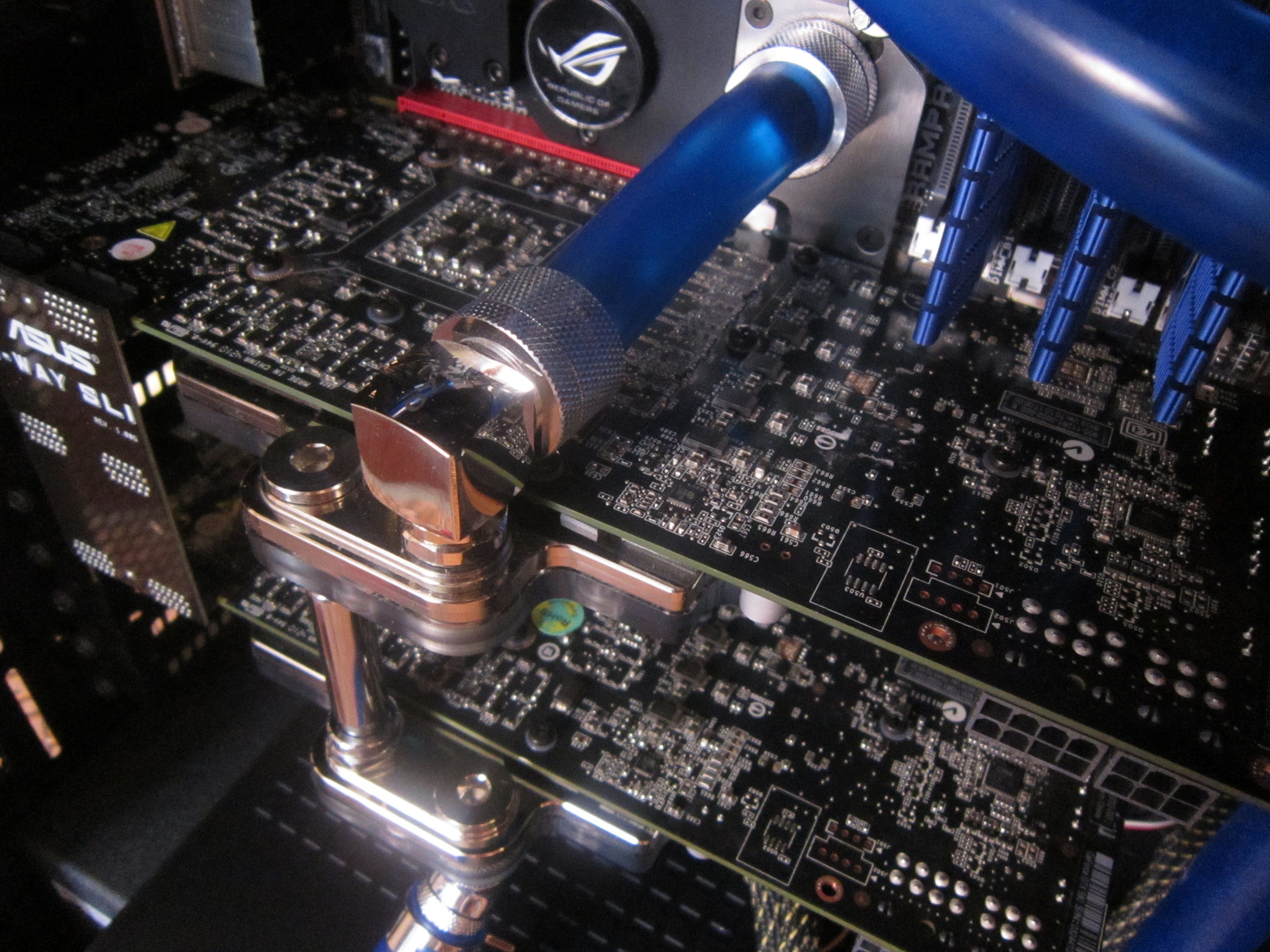 квад сли х8/х8, т.к. одна пашет х16/х16 (магия ). даже х8/х8 за глаза, если честно. потом, когда будет нормальная полноценная замена с х16/х16, то, может быть, я подумаю... от видео шланг снизу перегибается сильно, т.к. мешает питальник, а 90-град. уголок от альфакула, ска, потек! на радиаторе вентили стоят на пулле, т.е. как раз усасывают от стенки в комнату, но всяко времянка. лайт с 9-ю тайфунами на полных 1850 оборотах дает дельту в 3-4 градуса, на 800-900 оборотах ~5-6 градусов (справляется ) проставка не понадобится, т.к. термодатчик уберу, толку от него как с козла молока.
