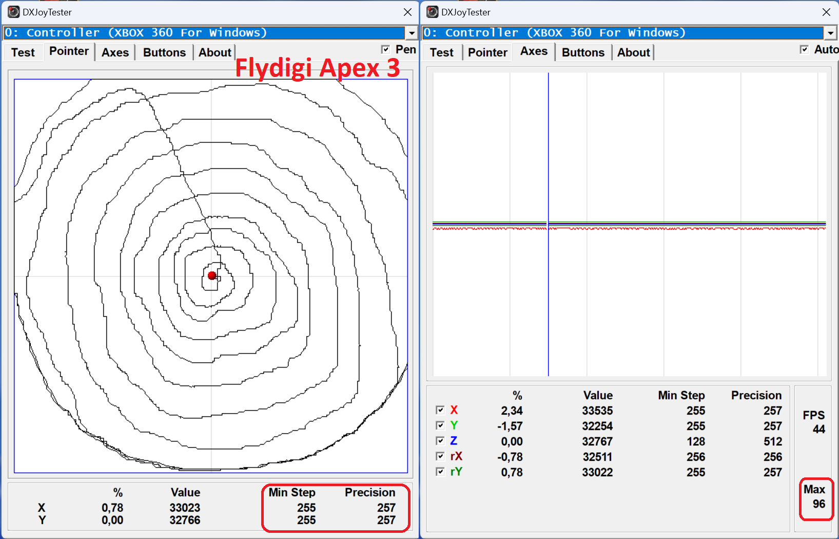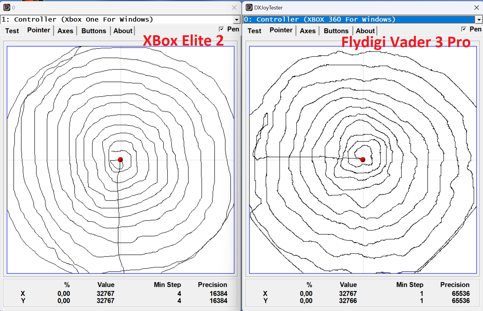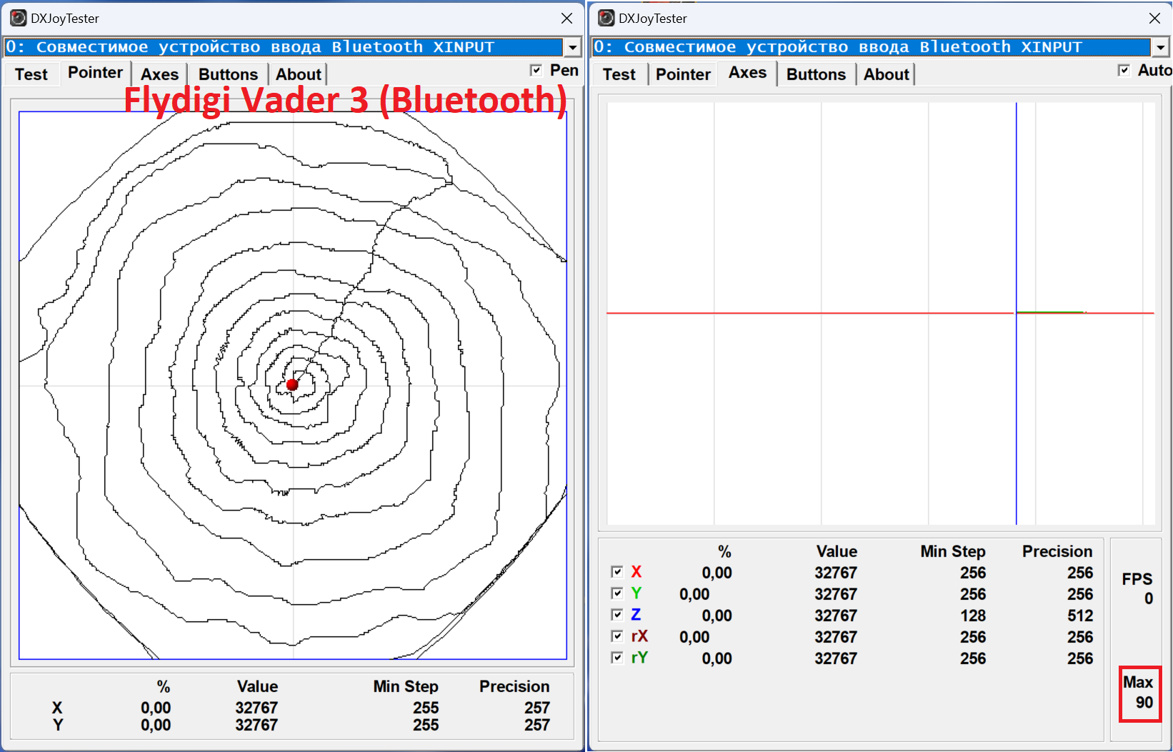 При этом, по ощущениям, стики XBox Elite 2 самые точные. Но частота опроса не выдающаяся, конечно. XBox Elite 2 подключён через XBox Wireless Adapter, третий вейдер через комплектный FlySync адаптер, а DualSense по Bluetooth. Что интересно, при подключении по Bluetooth у третьего вейдер число шагов на ось значительно ниже. То же самое касается частоты опроса.