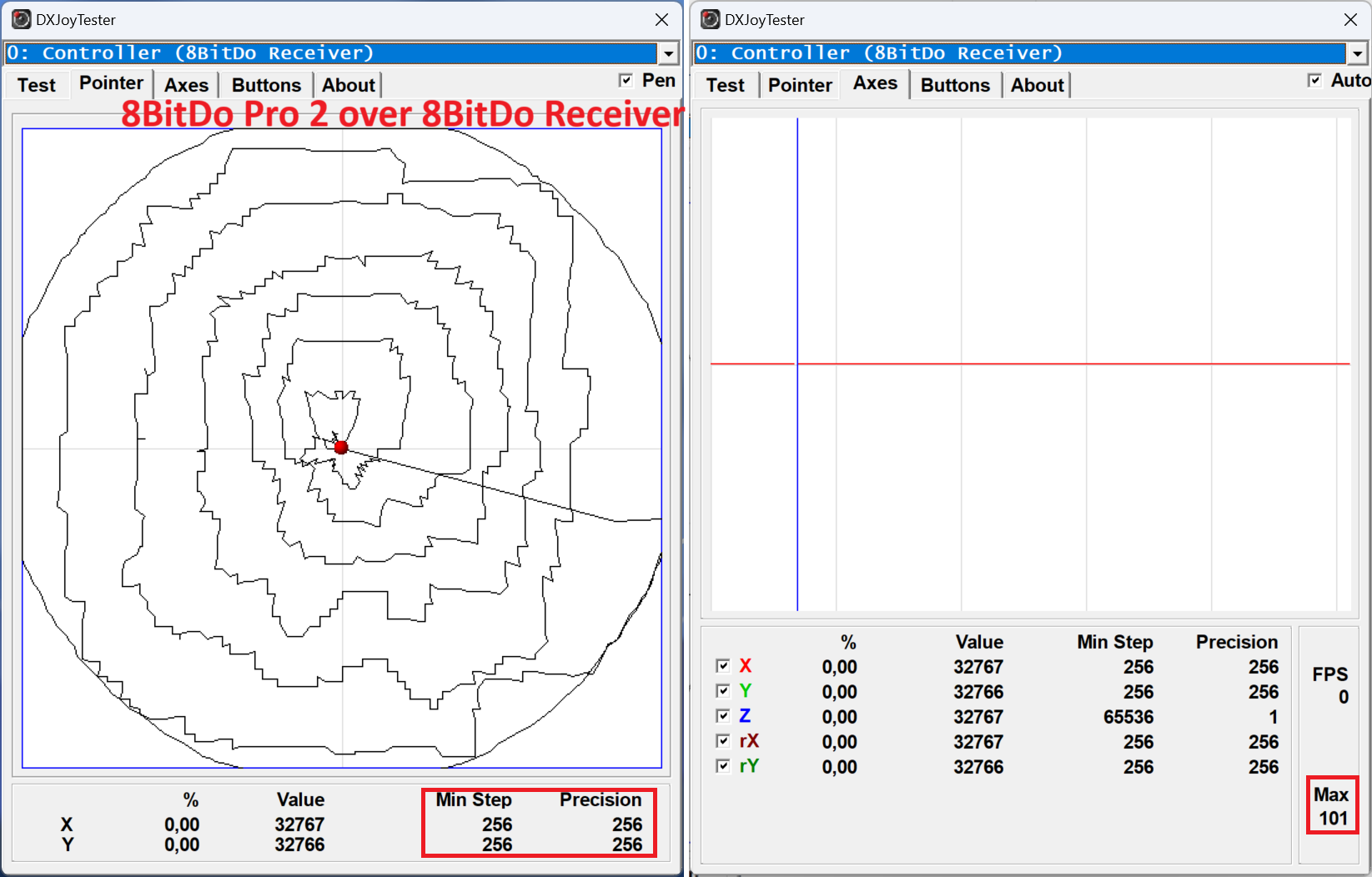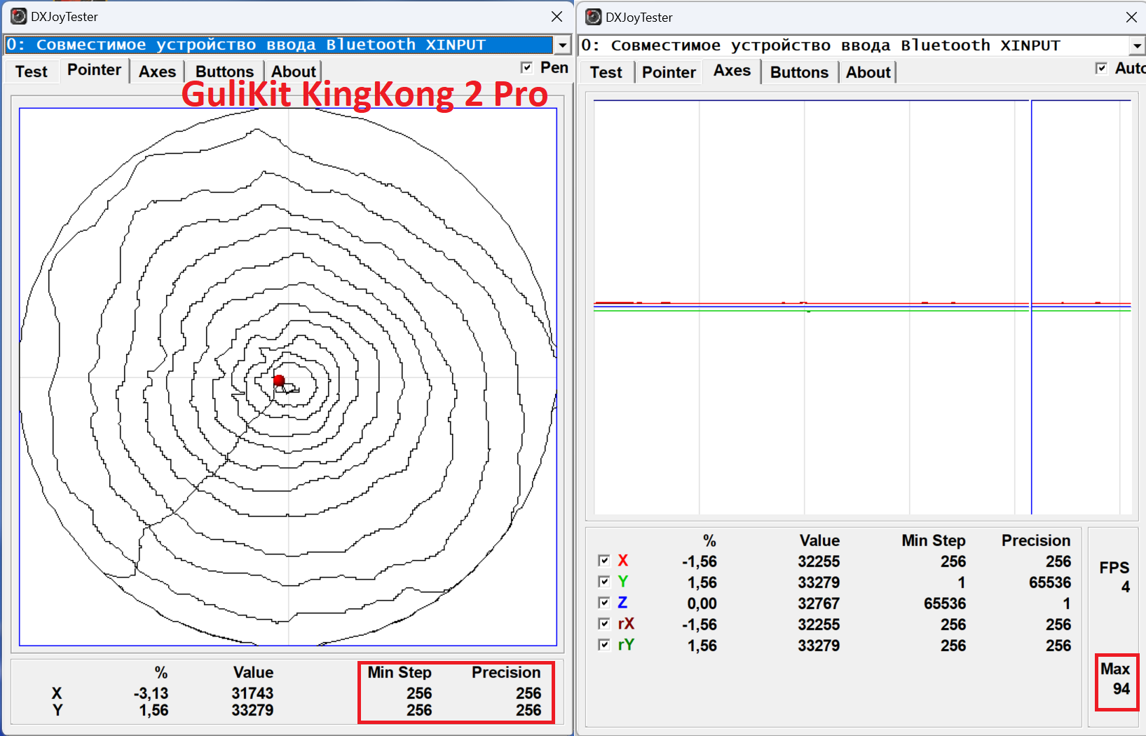 Добавлено спустя 3 часа 49 минут 1 секунду: А вот результаты GuliKit KingKong 2 Pro и 8BitDo Pro 2. Казалось бы, Min Step одинаковый для обеих моделей, а графический тест при этом показывает значительно большую дискретность по шагам у 8BitDo Pro 2: