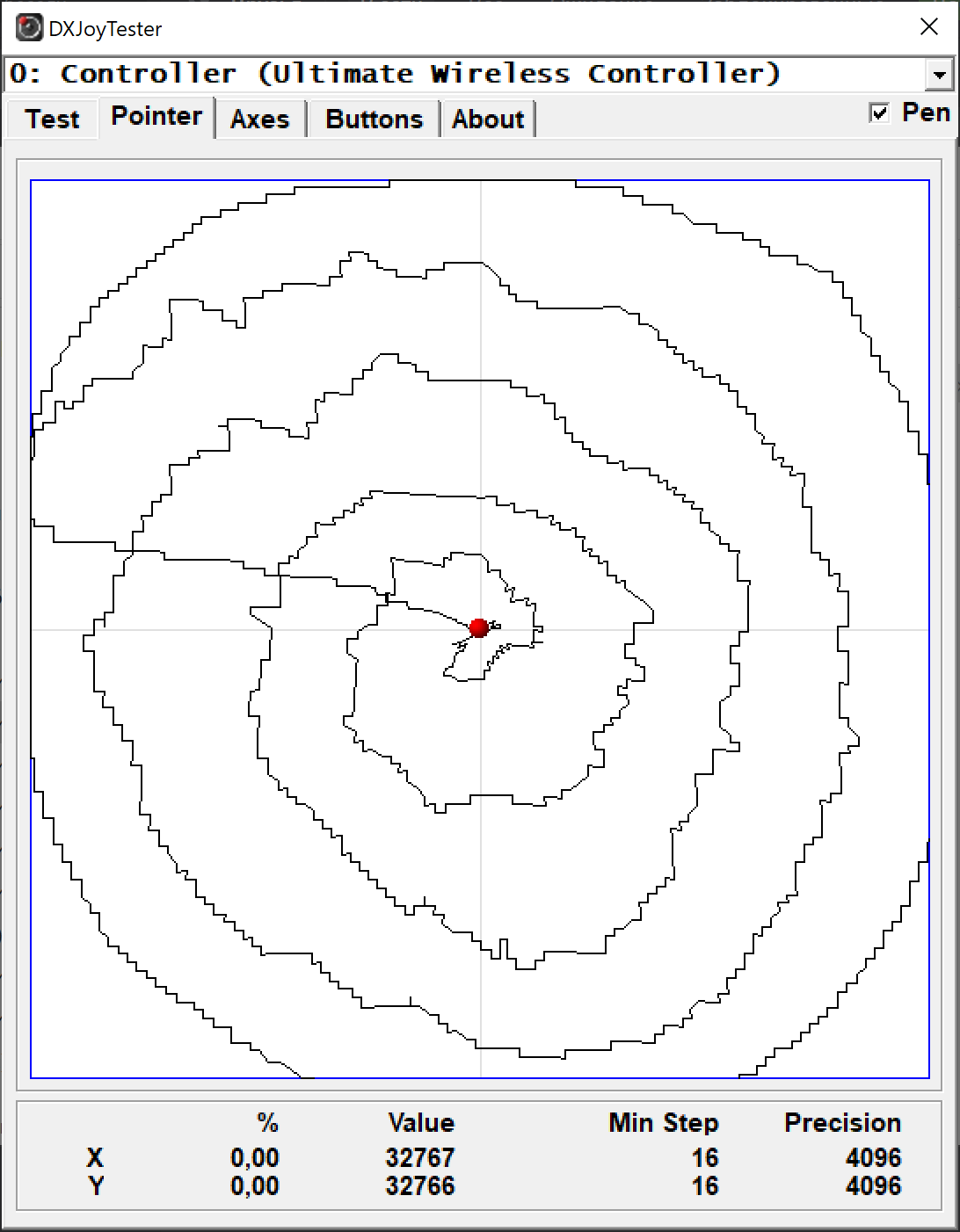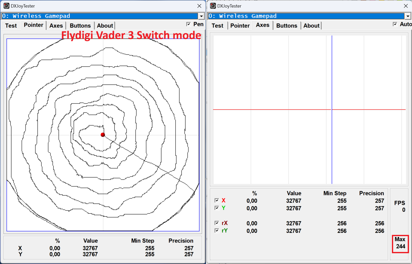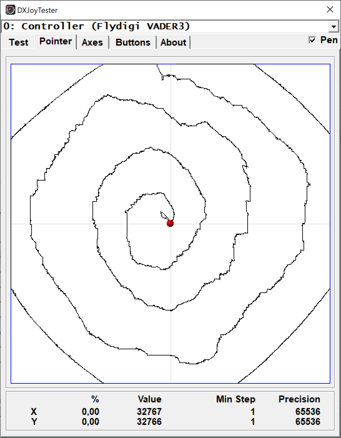 ZAMHome Вы смотрите не финальное значение "координат", а на минимальное приращение (изменение) этого значения. На финальное значение как будто накладывается шум и поэтому довольно затруднительно попасть в одну и ту же точку и так же, по-моему, имитируется высокая разрядность стика. Но вот минимальное изменение имеет вполне определенное значение(у меня получилось 0.6% для FlyDigi Vader 3 Pro), стик все равно движется рывками как бы плавно вы не двигали, перескакивает довольно большое количество точек условной координатной сетки 4096 x 4096.