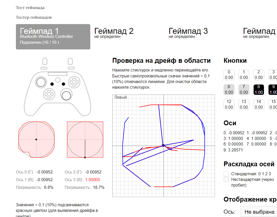 Здравствуйте. При подключении 8bitdo ultimate 2.4g по bluetooth к ПК получается такая картина в геймпад тестере. На андройде всё хорошо. Точно такое же я видел с дуалсенс и на пк, и на андроиде, но там чем-то вылечилось, даже не знаю, что помогло. Можно ли как-то пофиксить работу dinput у 8bitdo ultimate 2.4g на пк? Такая работа не предусмотрена, но всё же хотелось бы не занимать лишний слот usb...