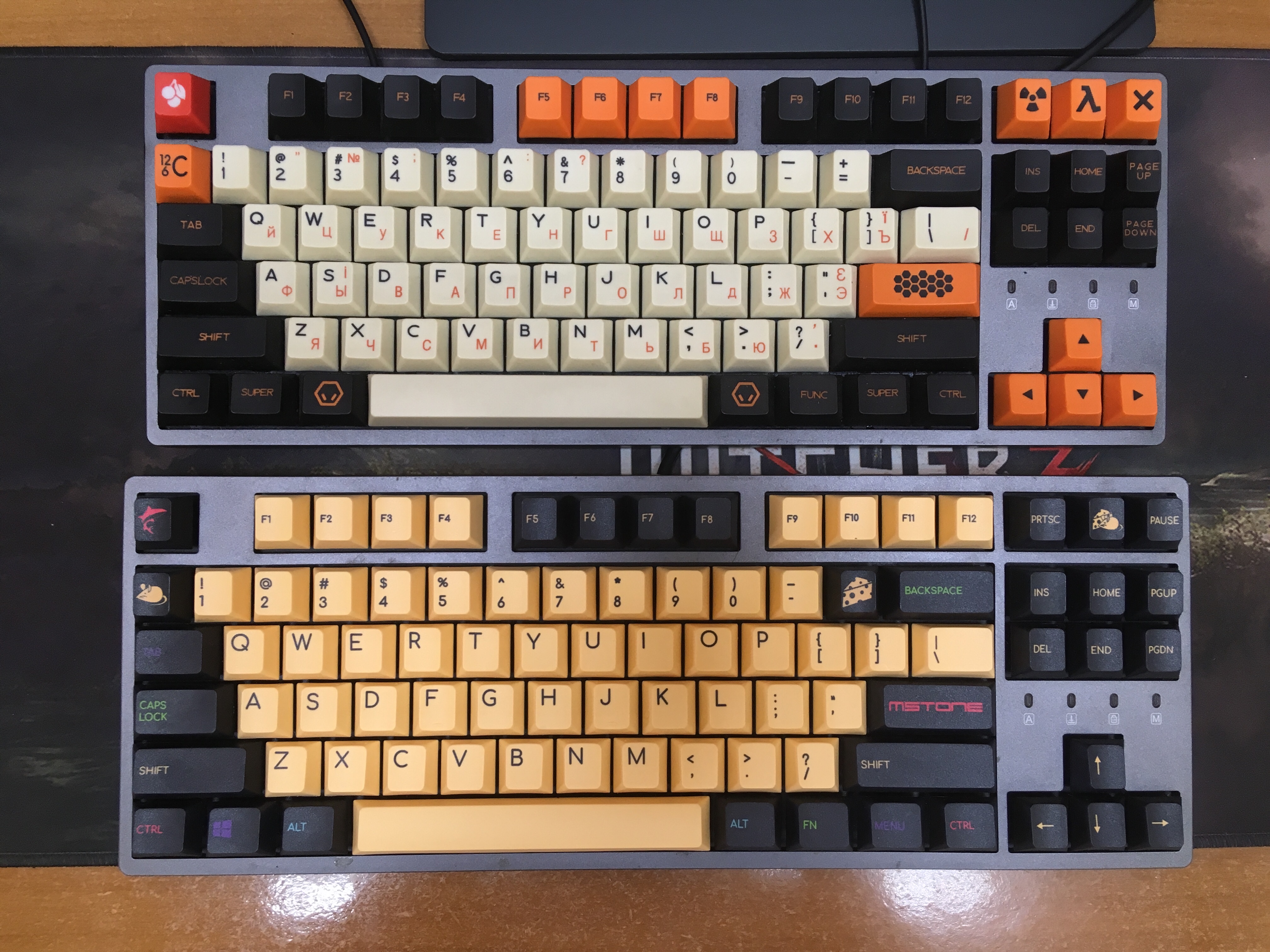 Мой карабон сет среднего качества (с сублимацией), у Y1ROK вариант даблшот более толстые. Мой - https://ru.aliexpress.com/item/32870771 ... 33edmcgMqJ Y1ROK - https://ru.aliexpress.com/item/32870559 ... c1ecFkivo8 По сравнению с моим карбоном, сырный от kbdfans наголову лучше. Все капы от 1.4 по толщине, пластик шершавый (временами напоминаем софттач) и ровный без заусенцев, легенды аккуратные и не толстые. Мне он реально понравился и по цветовой схеме, и по использованию. Одно но, темные капы = белый пластик с сублимацией
