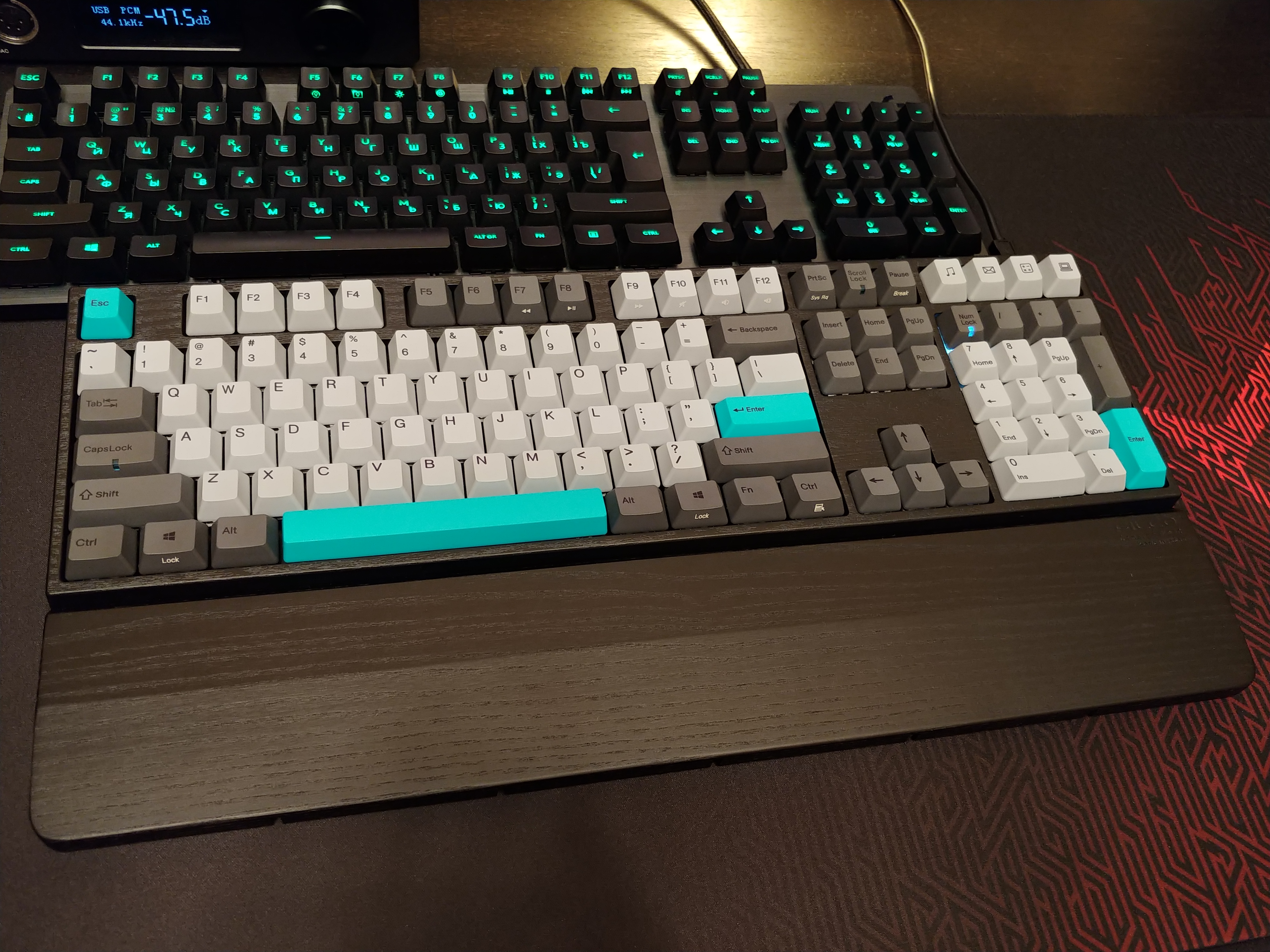Наконец-то спустя месяц приехала с mechanicalkeyboards Varmilo VA108M Moonlight на свитчах EC Ivy. Клавиатура - огонь, а вот со свитчами я облажался: при заказе где-то вычитал, что он тактильные, а они гады ещё и кликающие оказались. Думаю теперь aliaz заказывать, они нормально на вармилку встанут? И какие из них по силе нажатия ближе к mx brown? К клаве взял ещё и деревянную подставку под запястья, оказалась удобнее, чем мягкая от logitech g513.