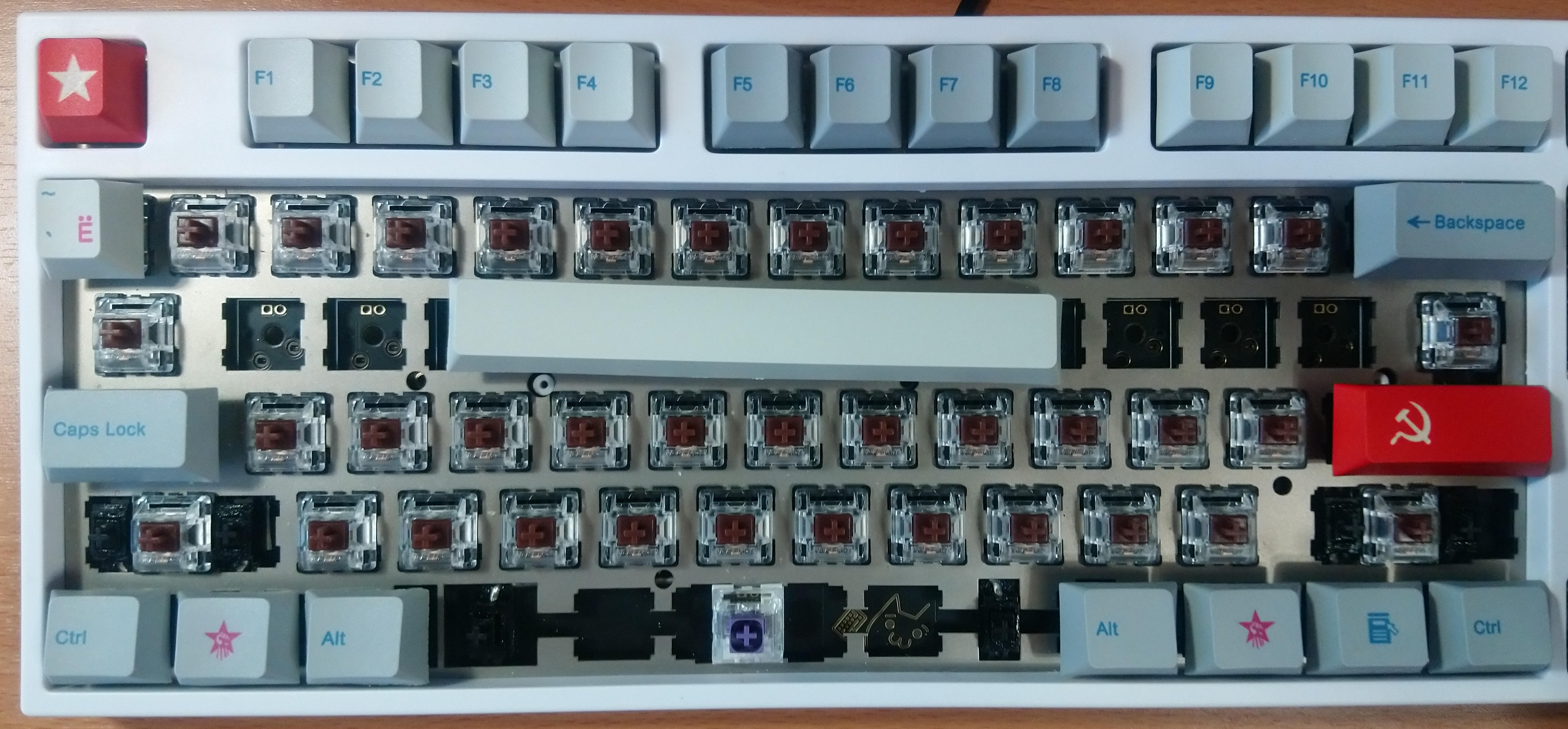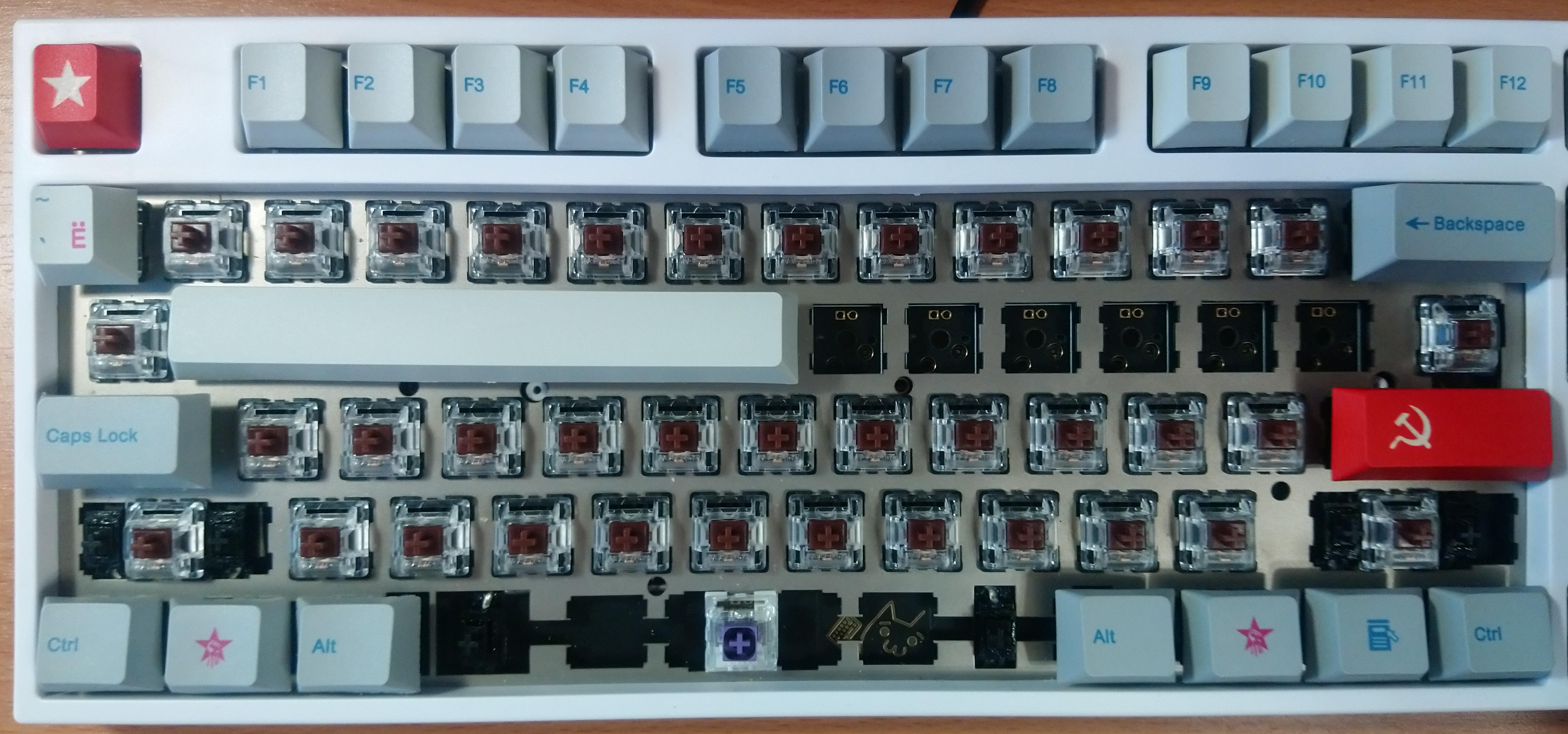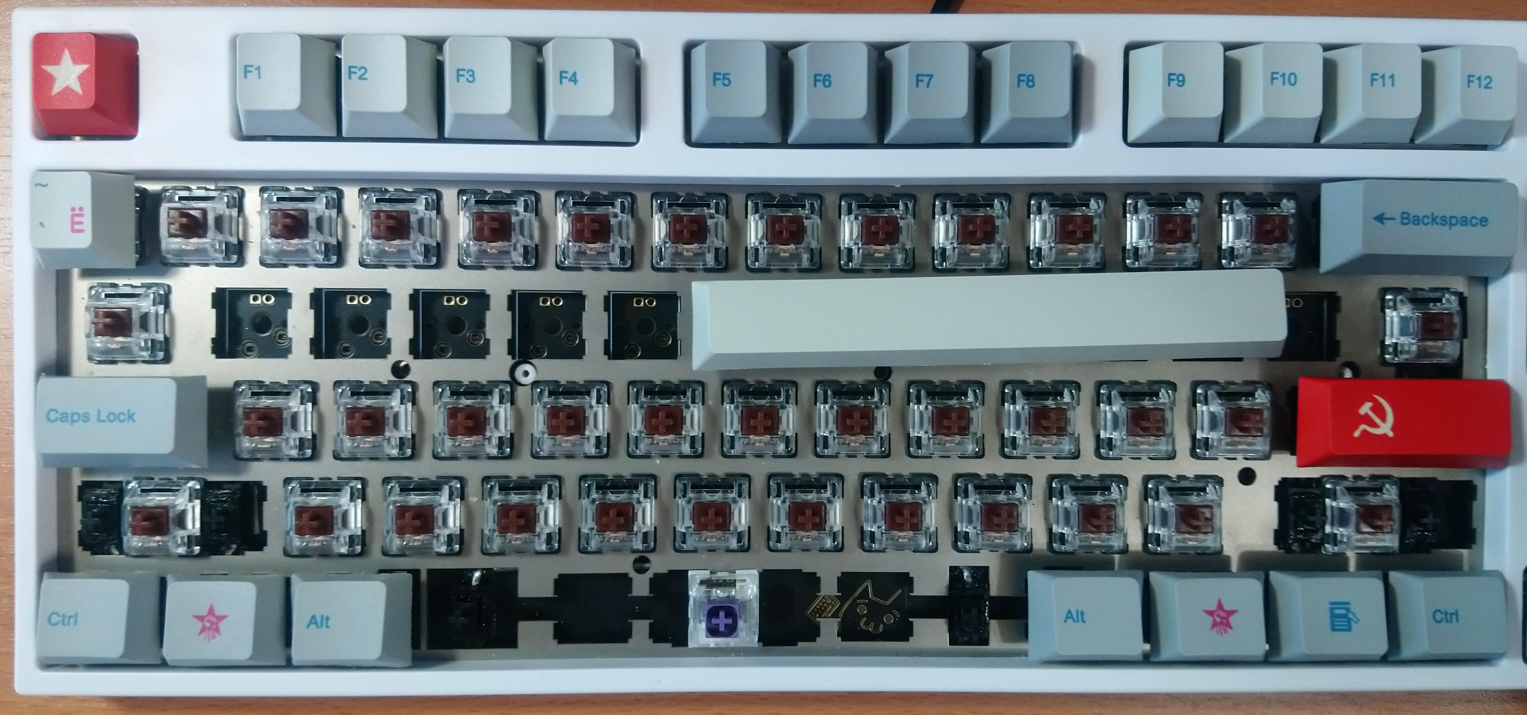 Пытался вчера поменять свитч на пробеле (показалось, что слишком легко прожимается) — так с половиной попробованных свитчей пробел заедает, а с оставшимися после сборки тремя Gateron Brown заедает со всеми — нормально работает только с тем, который я туда воткнул изначально