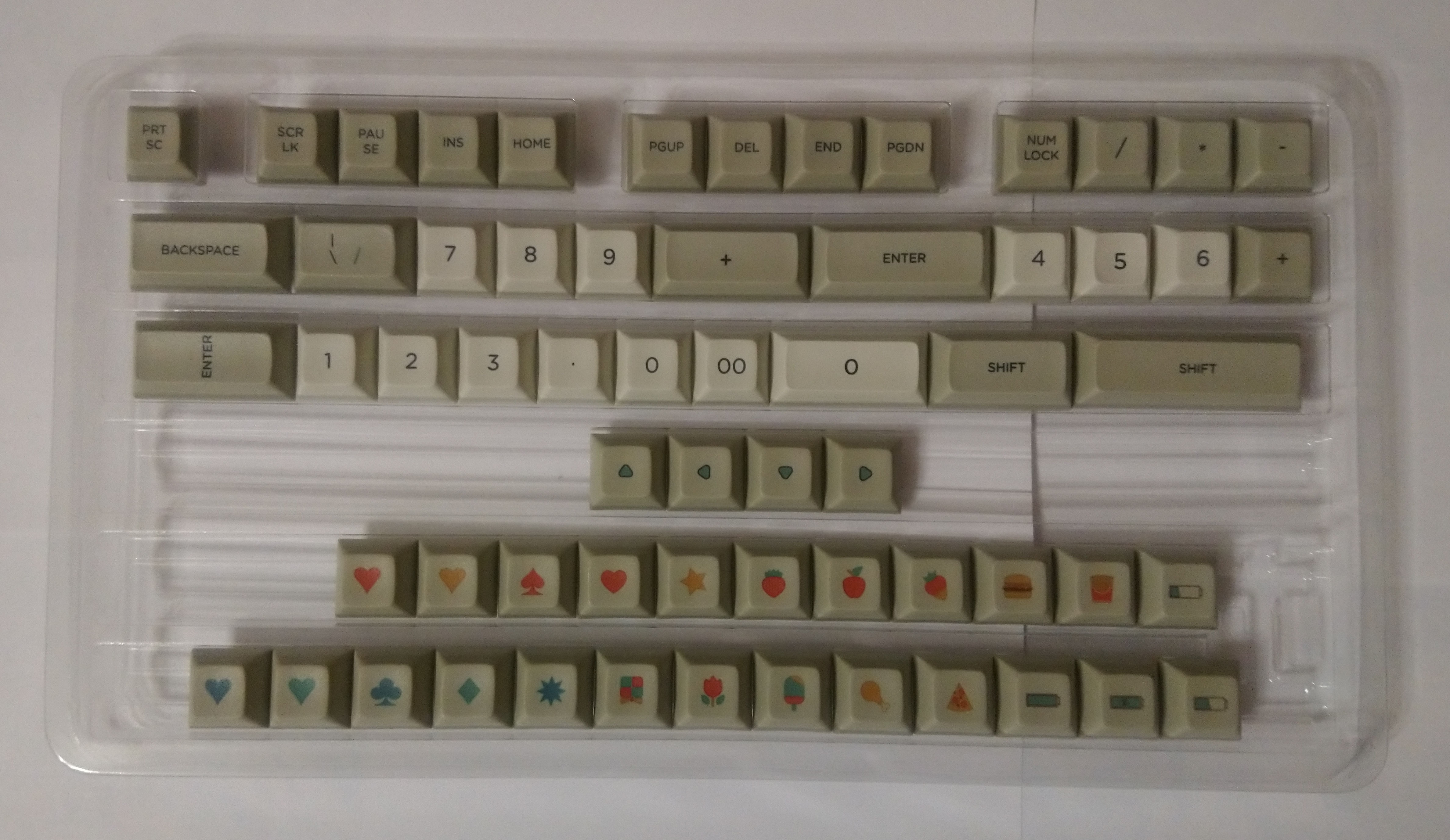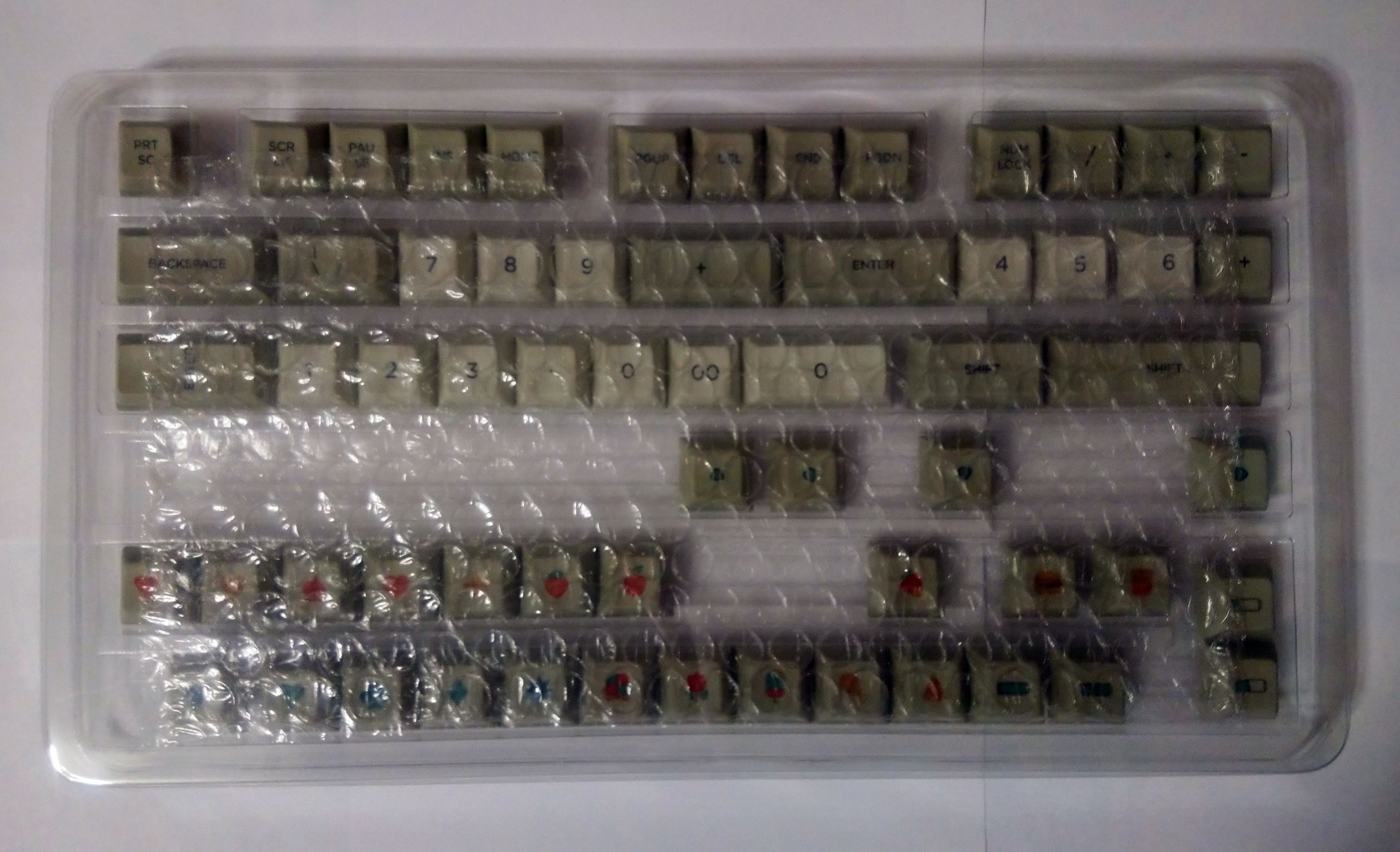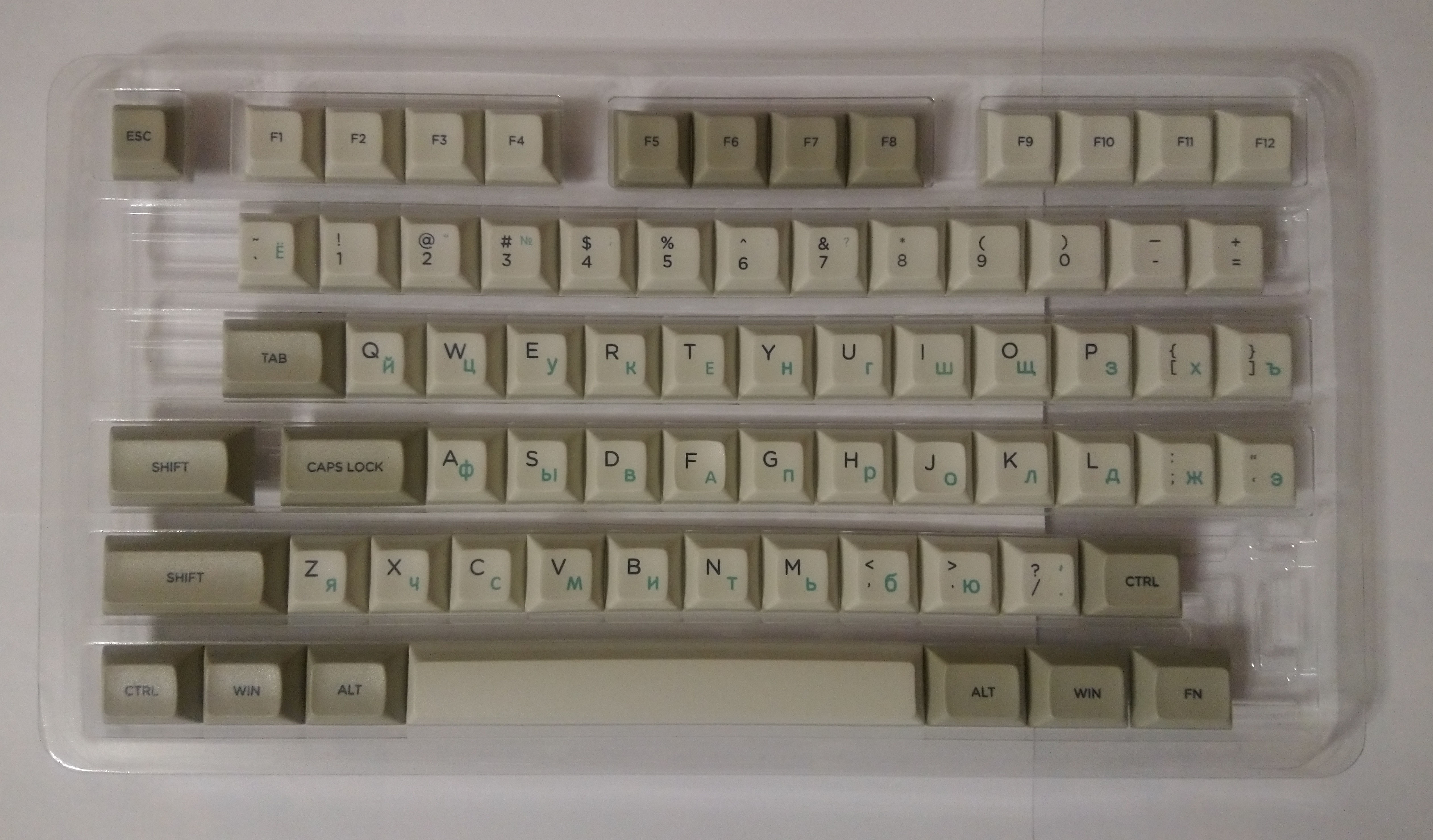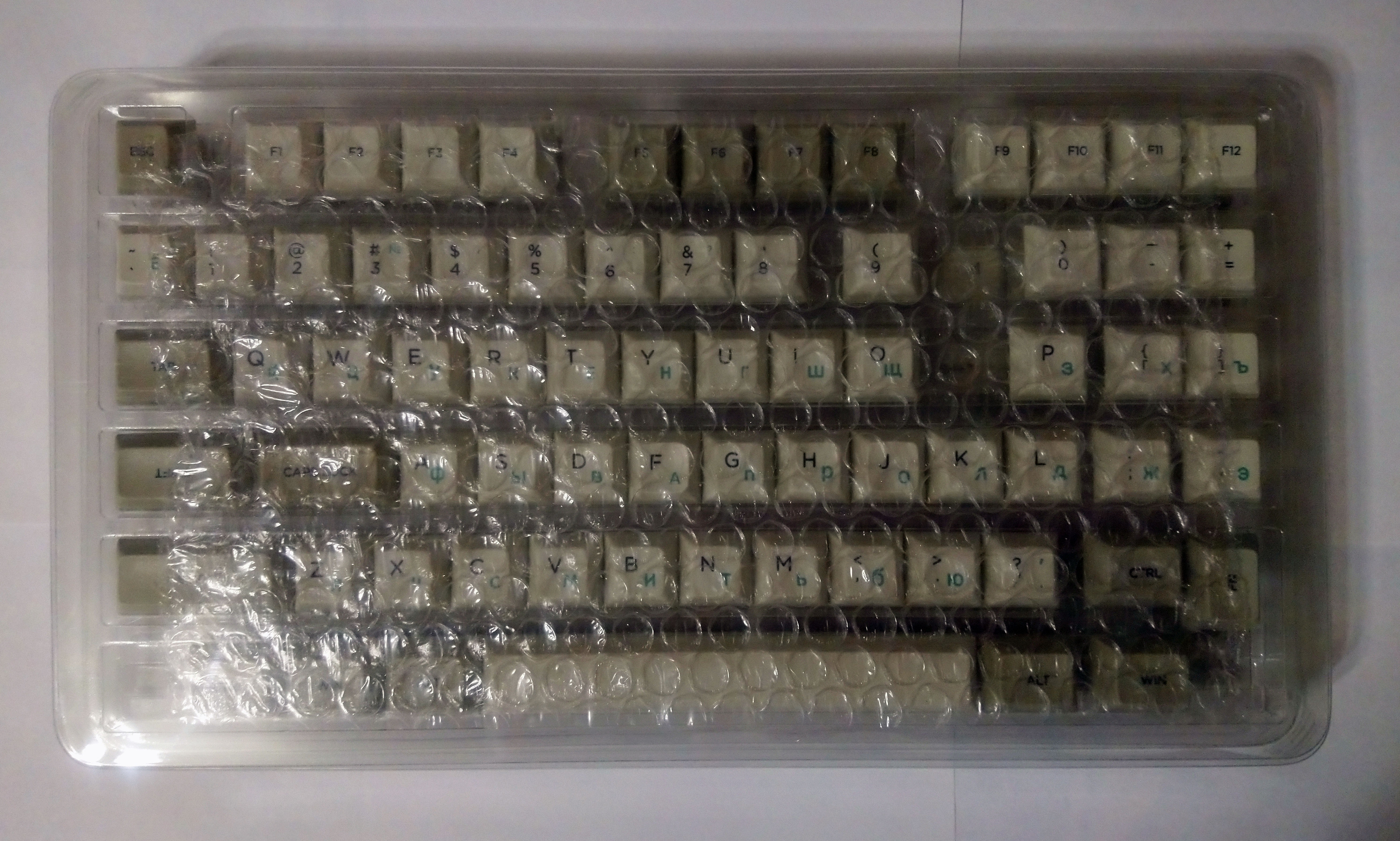 Из особенностей этого сета — кейкапа 1.25U с надписью MENU там нет, только 1.25U с надписью FN (что как раз совпало с моими настройками — точнее, у меня там LT(1, KC_APP), чтобы при коротком нажатии клавиша работала как Menu). Состав соответствует тому, что показано в описании на последней картинке (в разделе фотографий товара там показаны не все кейкапы — ещё есть 1.75U Shift), но у меня в коробке почему-то этот 1.75U Shift оказался в двух экземплярах.