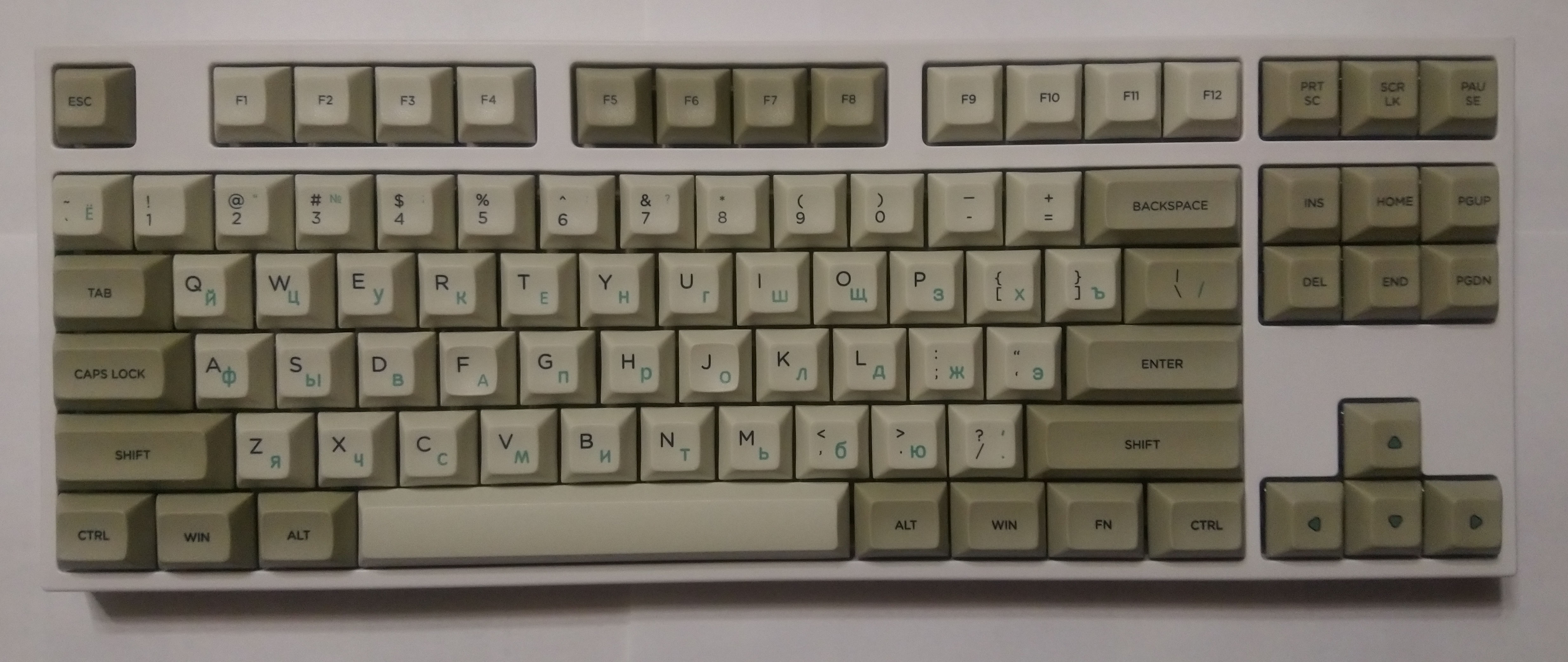 Ctrl размером 1.5U есть много где, а вот пробел 5.75U найти практически нереально, так что его нужно беречь. И ещё там вроде бы нестандартный Caps Lock (хотя тут может и совпасть с каким-то из вариантов Cherry stepped caps lock — их есть 2 типа, по фотографии определить сложно, нужно смотреть, как там смещён стем). Вероятнее всего, придётся смириться с тем, что после замены кейкапов получится что-то типа этого.