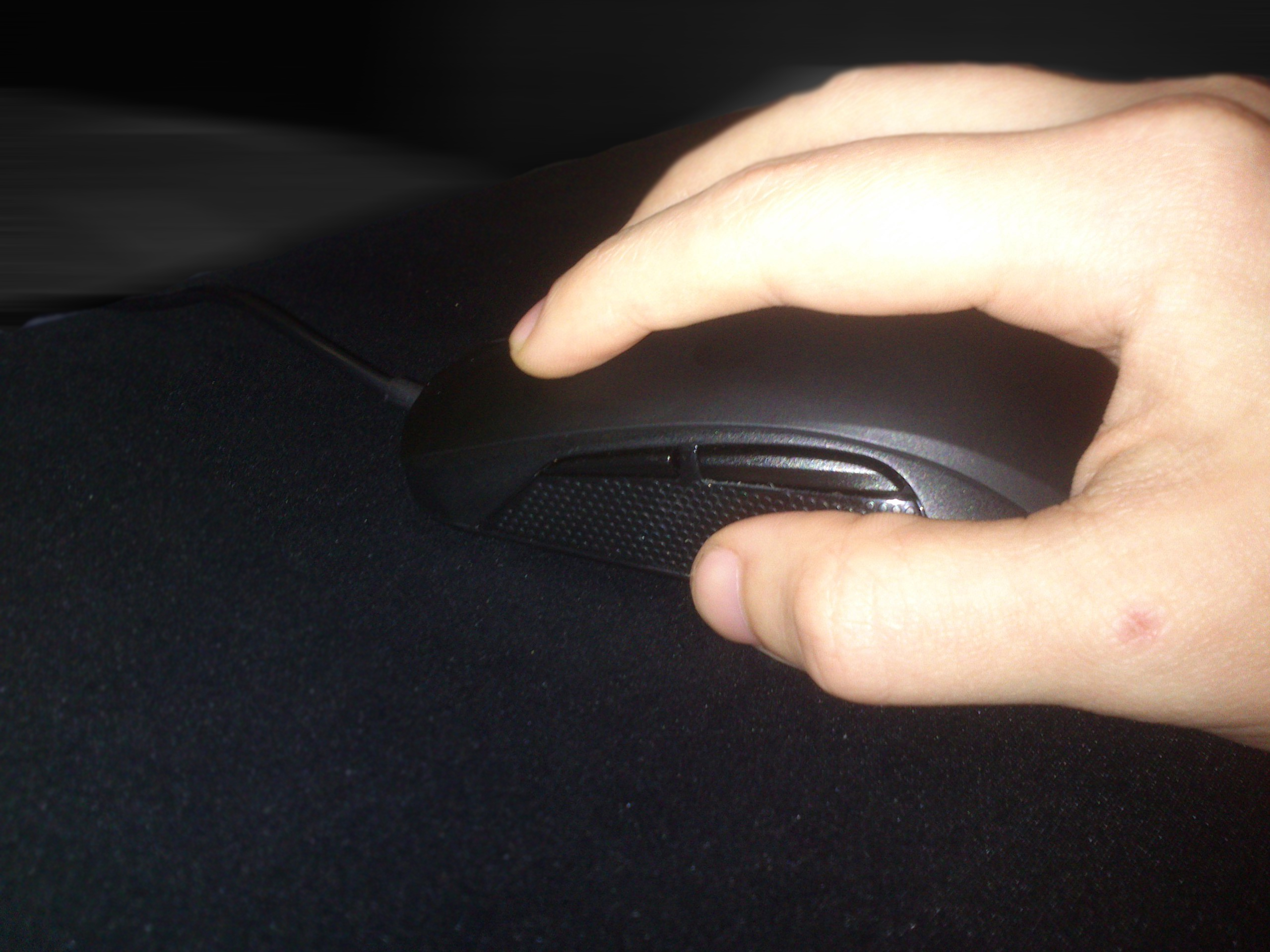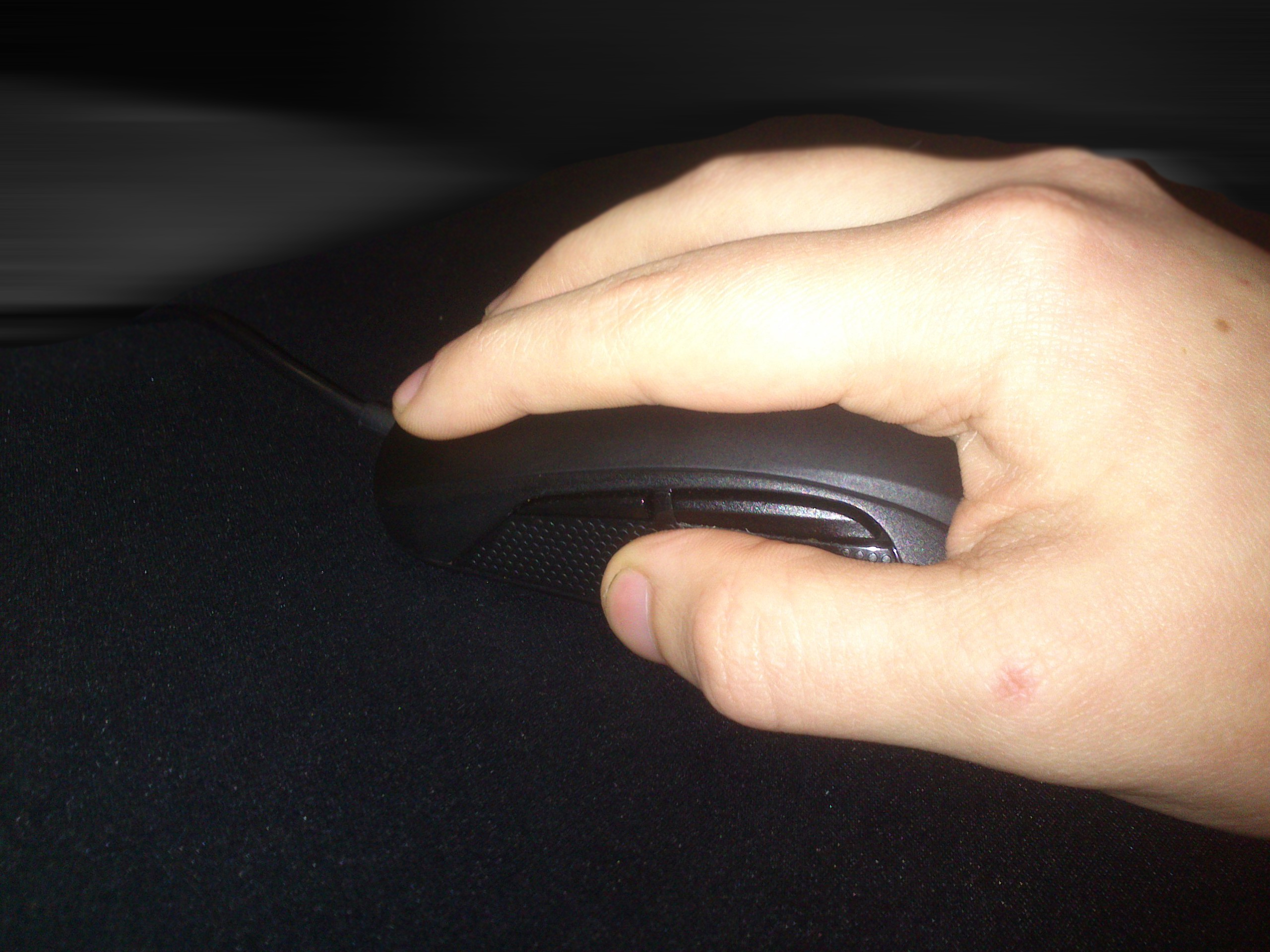 Хват пальцами #77 Ладонь не лежит на мышке. С одной стороны мышь придерживает большой палец, с другой безымянный и мизинец. Нажатие на на мышку происходит подушечками пальцев.