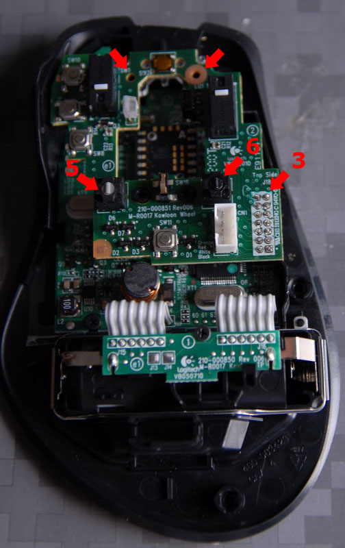 В G700 под АКБ винта НЕТ!!! Есть пять винтов под ножками по периметру (оранжевый маркер на фото), далее разъединяем курпус, вытаскиваем шлейф боковых кнопок, вытаскиваем стопорный клин колесика, отворачиваем металлическую пластину в передней части мыши (АККУРАТНО, ТАМ 2 МАЛЕНЬКИЕ ПРУЖИНКИ), отворачиваем два винта крепления пластиковой стойки колесика. Теперь см фото: Нижнюю плату крепят 4 винта (красный ромб), два из них около батарейного отсека, еще два под микриками ЛКМ и ПКМ, добраться до которых без спец инструмента или без распайки 14 пинов нельзя. Клики колесом вправо\влево разные, т.к. стоят разные микрики, см фото.