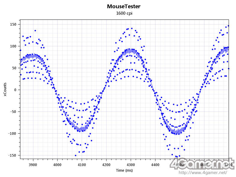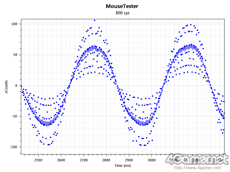 но тут надо учитывать что на графиках отображается не положение а курсора, а величина приращений смещения. т.е. каждая точка это значение ( число) которое послала мышь относительно предыдущей точки. эти значения, ака отчеты, мышь шлет через интервал равный 1/частота опроса, т.е. для 1000Гц, это 1мс. но если по какимто причинам мыша делает паузу (синхронизует чонить или еще чо, вообщем отвлекается ) т.е. шлет не через 1мс, а скажем через 3мс то она шлет просуммировное занчение за эти пропущеные 2 мс. ну т.е. если каждую 1мс она должна была слать число 10, то взяв паузу, она значения не отбросила а просуммировала, и после паузы выдала сразу 30. На графике отсчетов мы видим это как выброс, а на смещении курсора этого естно нет т.к. он сместился на ту же величину - какая разница смещаться три раза каждую миллисекунду на 10 единиц или сместиться один раз на 30 единиц за 3 миллисекунды.