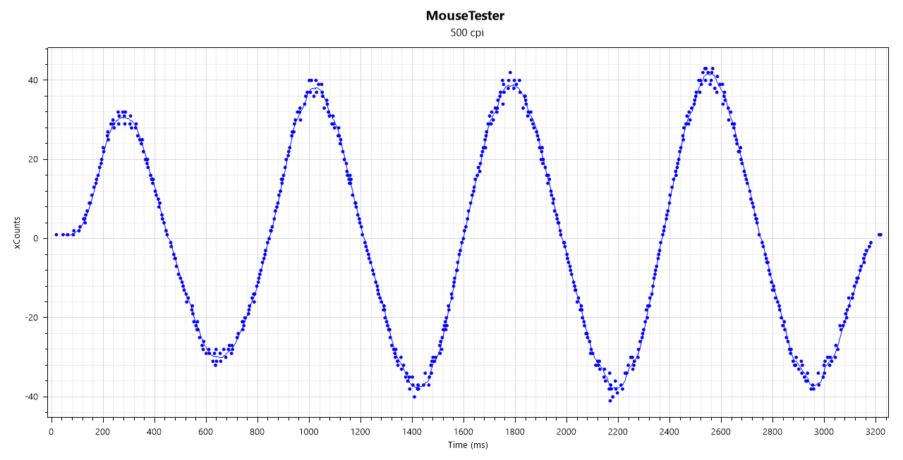 или по другому ты делаешь 3 прохождения коврика от края до края. умножаем ширину коврика на 3 и получаем общий путь который проедет мышка за 3 маха, пусть это будет 90см. Что при 500Гц, что при 1000Гц длина пути одинакова. Правильно? по твоему графику на 3 маха у тебя ушло 2000мс с копейками, округлим до 2000мс. при опросе 1000гц мышь шлет информацию о смещении каждую милисекунду. При 500Гц каждые 2 милисекунды. таким образом в первом случае за 2000мс мышь пошлет 2000 репортов, а во втором за теже 2000мс махания, пошлет 1000репортов. правильно? Но длина пути у нас неизменна 3 коврика или 90см. Значение на один репорт имеем "длина пути" / количество репортов. так? Значит при 2000 репортов (1000гц), у нас получится 90см/2000, а при 500гц - 90см/1000. т.е. во втором случае за интервал между репортами мышь проезжает больше, а значит и значение будет слать больше... но реже надо иметь ввиду что т.к. мышь движется неравномерно - максимальная скорость в середине коврика, а у краев она останавливается (скорость=0) и начинает разгон в обратную сторону, то и значения отсчетов будут соответственно у краев маленькие, постепенно возрастать к середине коврика, а после прохождения середины уменьшаться. но в одинаковых местах графика, т.е. при одинаковой скорости, во втором случае значения будут больше.