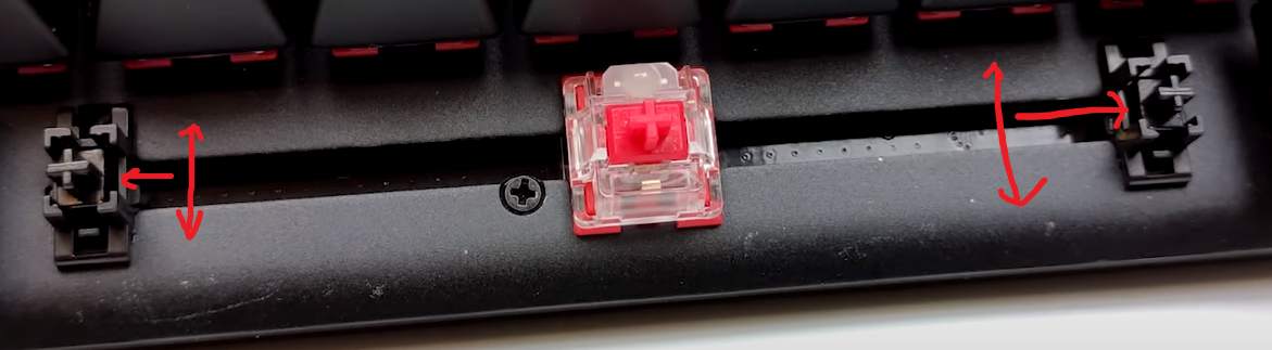 Стабилизаторы представляют из себя специальную систему, которая обеспечивает срабатывание длинных клавиш вне зависимости от точки нажатия. От её качества зависит равномерность хода таких клавиш как Space, BackSpace, Shift, Enter, + (NumPad), 0 (NumPad) и Enter (NumPad). Существует всего два оригинальных типа стабилизаторов, разработанных компаниями Costar и Cherry, но помимо них на рынке можно встретить массу более дешевых аналогов, производимых на территории Китая. Costar. Стабилизаторы Costar состоят из металлических клипс, металлического прута и пластмассовых крестовин. Клипсы устанавливаются на пластину, затем на них устанавливается прут, который вдевается в крестовины, которые, в свою очередь, вставляются в клавишу. Система от Costar полностью открыта и легко поддается ремонту в случае возникновения неполадок. Такие стабилизаторы принято смазывать силиконовой смазкой. Во-первых, нажатие станет более плавным, во-вторых – смазка позволит избежать неприятных звуков и скрипов при использовании. Плюсом стабилизаторов Costar обычно считается более приятные "ощущения" при нажатии по сравнению с Cherry. Минусы гораздо более осязаемые: во-первых, процесс снятия и установки кейкапа значительно более сложный, чем в случае с Cherry, во-вторых, без смазки при нажатии на клавишу могут издаваться неприятные звуки и скрипы. Cherry. Принцип работы стабилизаторов Cherry схож со стабилизаторами Costar, но главное различие заключается в том, что все части "спрятаны" под корпусом, поэтому при снятии клавиши сам механизм стабилизатора остается нетронутым. Основное преимущество стабилизаторов Cherry заключается в легкости снятия клавиши, клавиша снимается так же легко, как и с обычного переключателя. Минус заключается в том, что меняются ощущения при использовании клавиш с стабилизаторами: во-первых при отпускании клавиши удар получается чуть более жестким, а во-вторых, при выжимании клавиши до упора нажатие ощущается менее четко.