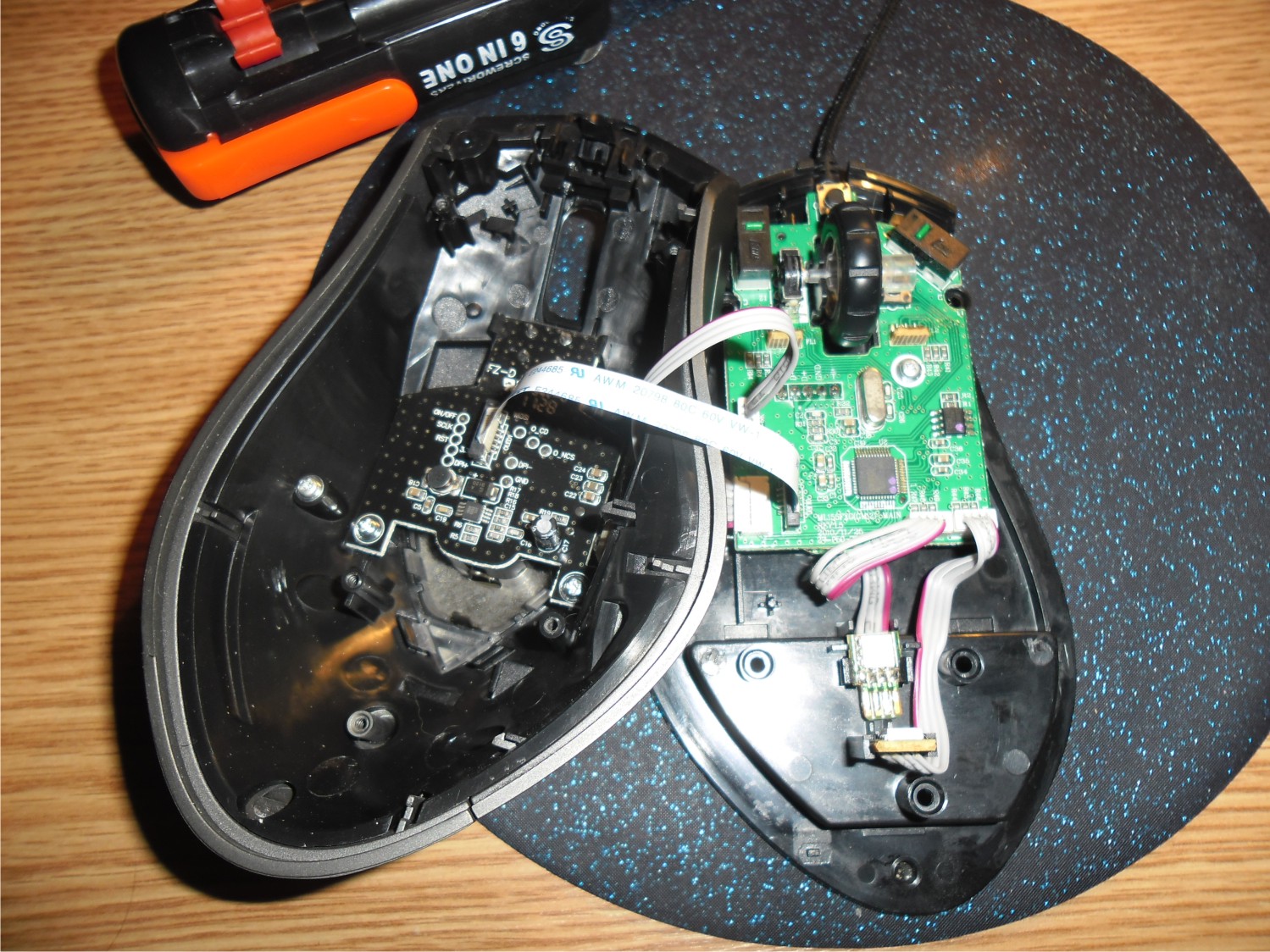 Всем хаба Мышь ("Sentinel Zero-G" )пользую уже год, нареканий нет вообще. Покупалась как рабочий инструмент для ваяний в фотошопе, до этого была "A4tech XL-760", а до нее "Logitech G1". Решил не экономить на себе (как всегда, впрочем) и не пожалел ни разу. Грызун большой и тяжелый, в руке сидит как влитой, движения точные и выверенные (юзаю +5 сенсу и 1600 DPI). Шкурка не облазит, появилось небольшое помутнение на корпусе в районе большого пальца, но это мелочи жизни. Итак, хотя и не раз зарекался, всё же, в порыве ярости, мыша танканула и приняла на себя серию ударов кулаком по спине Как итог дисплейчик сошел с орбиты и провалился в отверстие, в котором сидит.... Решился разобрать. Собственно, ничего сложного, естественно, нет. Аккуратно, чтобы не деформировать, отклеиваем боковые лапки (можно и не полностью, главное освободить отверстия с шурупами, они расположены ближе к кнопкам крысы), достаем паралоновую прокладку в отсеке с грузиками, видим там еще 3 шурупа. Не торопясь (чтобы не повредить шлейфы), отсоединяем крышку корпуса - видим, что скроллер жутко пострадал от линяющего котэ =) Там же, на крышке, наблюдаем плату, которую удерживают 2 шурупчика и крепление. Вынимаем ее очень осторожно и добираемся до стеклышка дисплея, не сильно надавливаем на него и возвращаем на круги своя - профит! Важно: при сборке зажимать болты под лапками нужно очень хорошо, иначе корпус будет непроизвольно разъезжаться в передней части, поэтому здесь силы не жалеем ^_^