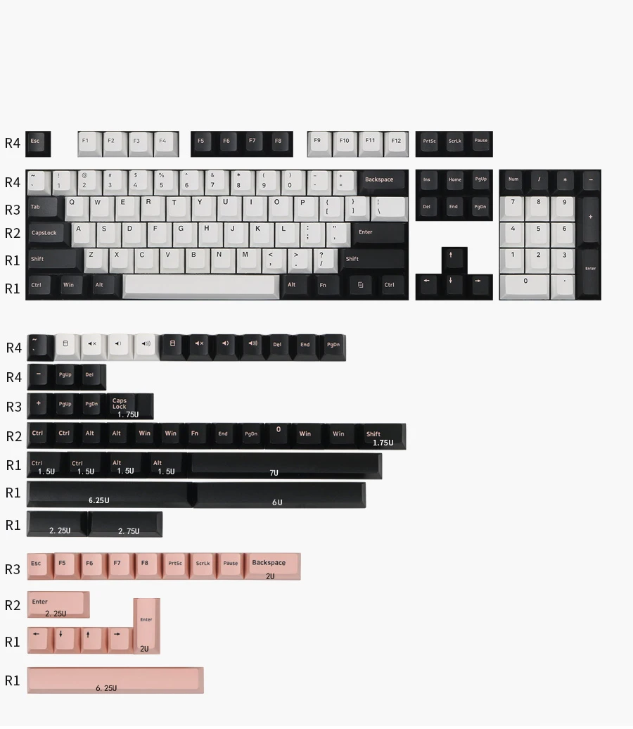 Цифровой ряд (внизу на некоторых капах обозначен как R1, на фото из описания — как R4) — 2 набора (чёрные и белые) из 4 медиа-клавиш (калькулятор, громкость –/+/выкл); чёрные ~/`, Del, End, PgDn; розовые Esc, F5…F8, PrtSc, ScrLk, Pause, 2u Backspace.