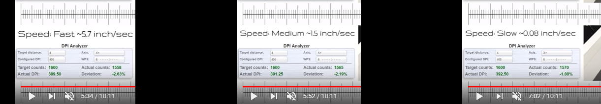 AloneInTheDuck сначала ведем мышь на медленной скорости, потом резко возвращаем в начальную позицию. Если есть ошибка то значит есть акселерация. т.е. мышь на разных скоростях рапортует о разном смещении. в тесте по ссылке мыши перемещают на разных скоростях, но ошибка на всех скоростях одинаковая - вывод акселерации нет, есть неточность отработки назначенного дпи.