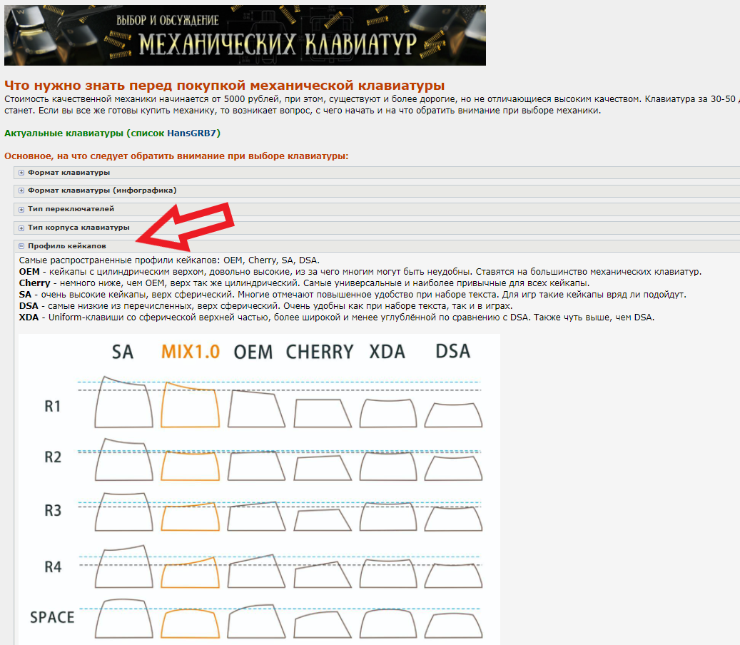 Самые распространенные профили кейкапов: OEM, Cherry, SA, DSA. OEM - кейкапы с цилиндрическим верхом, довольно высокие, из за чего многим могут быть неудобны. Ставятся на большинство механических клавиатур. Cherry - немного ниже, чем OEM, верх так же цилиндрический. Самые универсальные и наиболее привычные для всех кейкапы. SA - очень высокие кейкапы, верх сферический. Многие отмечают повышенное удобство при наборе текста. Для игр такие кейкапы вряд ли подойдут. DSA - самые низкие из перечисленных, верх сферический. Очень удобны как при наборе текста, так и в играх. XDA - Uniform-клавиши со сферической верхней частью, более широкой и менее углублённой по сравнению с DSA. Также чуть выше, чем DSA.