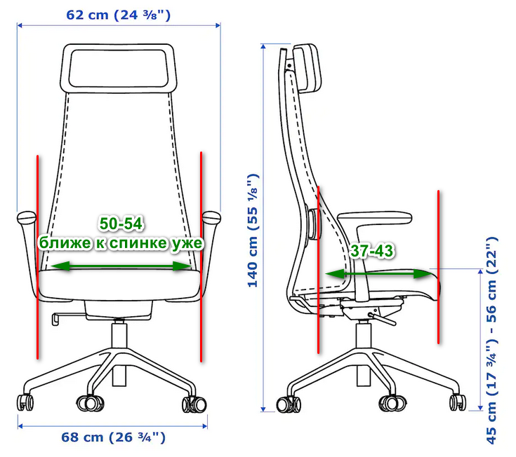 Съездил в икею, посмотреть на кресла. В итоге как много где и писали маркус более плюшевый. Особенно тот что в коже. Эрвфь проще под себя настроить. У маркуса мне прям очень не понравилась та вставка в области поясницы. Очень она какая то навязчивая что ли. У эрвфь её можно в крайнее нижнее опустить и она почти не даёт о себе знать. В глубину у обоих сидение оч маленькие после бюрократов. Но у второго оно чуть глубже 43(в максимальном) против 41 у маркуса. мерил от сетки в ближайшем положении, и в максимально вертикальном положении.