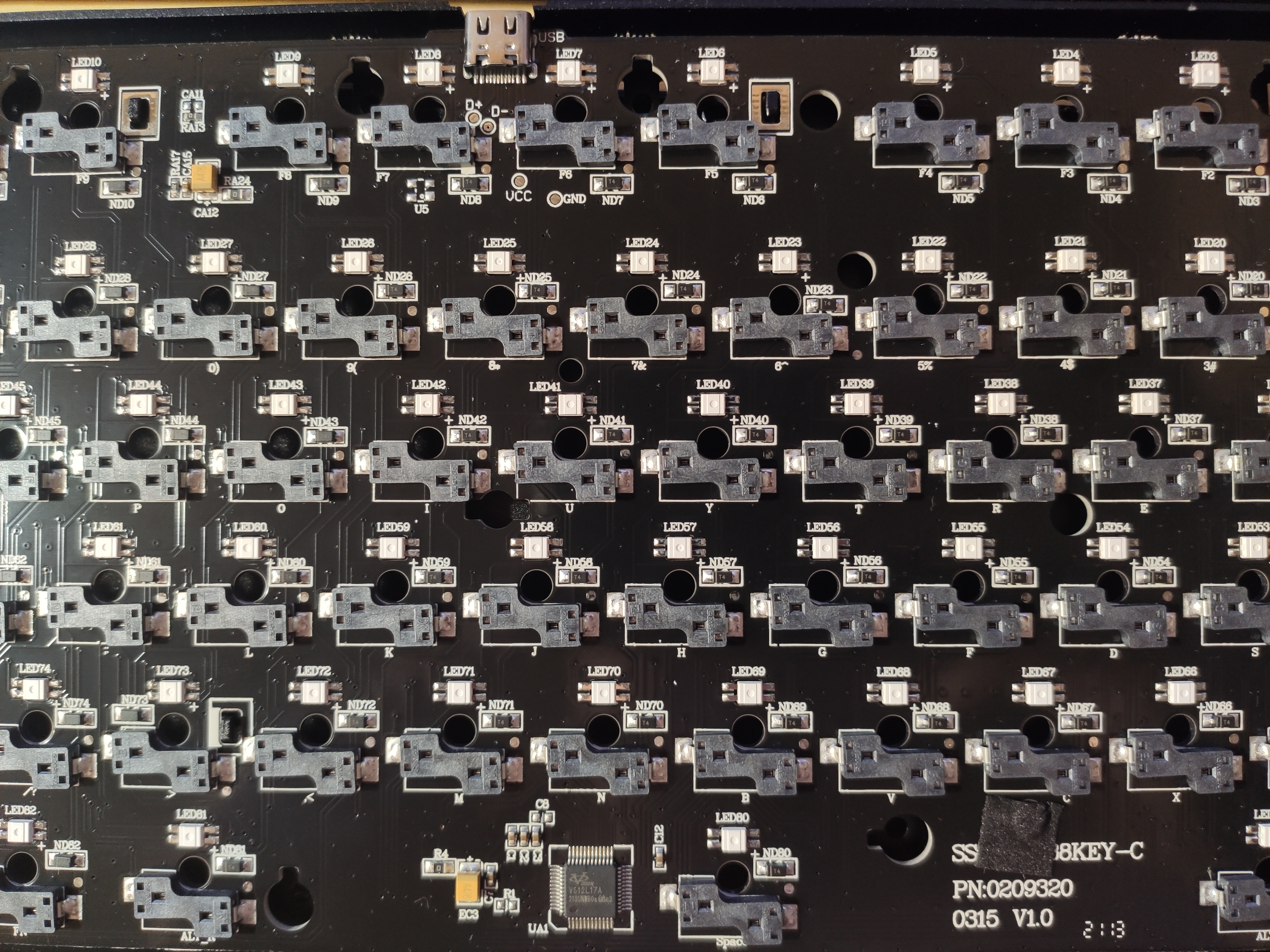 Похоже, на месте U5 должен был стоять чип для защиты USB от разрядов статики, однако производитель посчитал, что не ставить его, во-первых, дешевле, во-вторых, приведёт к тому, что покупатель быстрее пойдёт в магазин за новой клавиатурой Кроме того, в районе USB-разъёма нет пары резисторов 5.1к, что, вероятнее всего, означает, что при подключении к порту USB Type C кабелем C-C эта клавиатура работать не будет (и действительно, относительно свежая жалоба на неработоспособность GMMK TKL при таком подключении таки имеется). (Если вдруг возникнет необходимость такого подключения, придётся использовать лишний переходник, чтобы подключить по схеме C-A-C, или промежуточный хаб опять-таки с портом типа A.)
