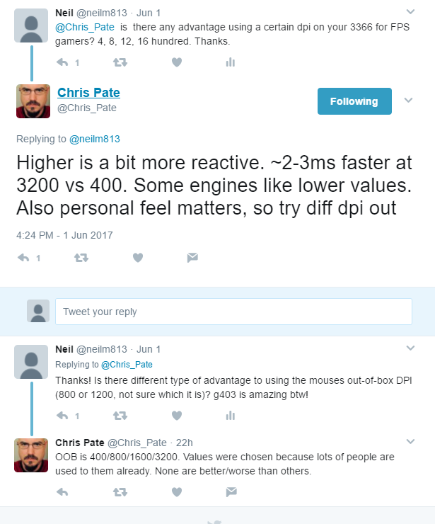 А зачем его толковать? Чел пишет, мы читаем . В следующем послании он говорит, что при установке 3200 cpi задержка у 3366 на 2-3 мс меньше, нежели при 400 cpi. То ли у самого датчика 3366, то ли у какой-то мыши в сборе, то ли у какой-то всей системы "мышь -> результат в некой программе". Хрен его знает, что он имеет ввиду, отвечая на неказистый (но актуальный) вопрос какого-то Нила. Упоминает также о личных симпатиях. Как движковых (вероятно игровых) - к мышиным чувствительностям пониже, так и человеческих - к разным cpi. Мол, можете сами пробовать и выяснять, что вам по вкусу .