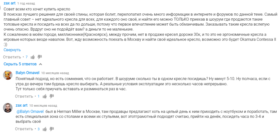 - посидеть в кресле хотя бы 2-3 часа? Ты понимаешь, что такая возможность далеко не у всех есть даже в москве. Вся остальная страна покупает кресло вслепую.