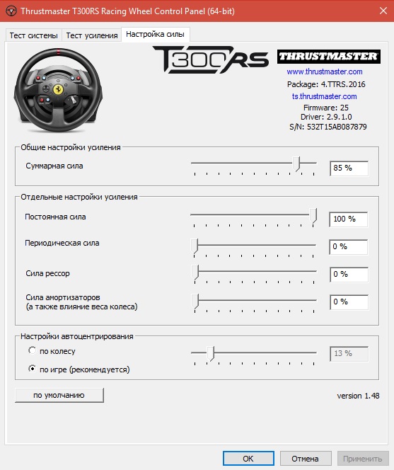 Фидбек. Мертвая зона практически отсутствует, фидбек мягкий и четкий. Особенно хорошо чувствуется разница в корсе, после четкого фидбека Ира я уж думал заброшу Корсу совсем, вымораживала пустота руля на г25, на т300 эта пропасть между играми сильно сократилась. Когда привык к т300, стал показывать результаты не хуже чем на г25, а может даже и лучше. Теперь могу отловить какую нибудь ГТ3 из заноса в корсе с вероятностью 20%, раньше вероятность была 0%. Пока играюсь с настройками самого руля, на данный момент такие настройки: