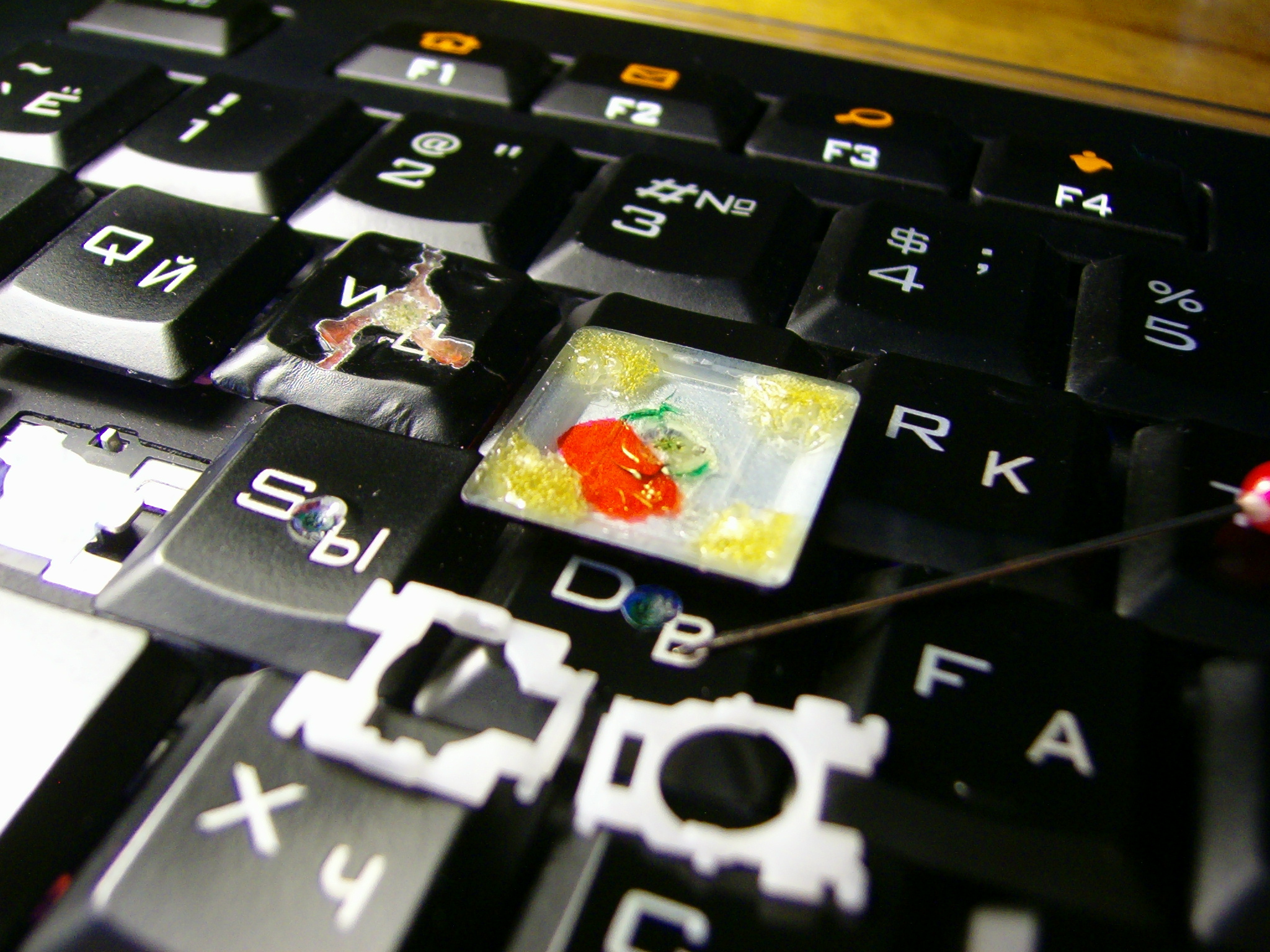см на фото W, на срез краски - это те самые крашеные от Logitech Illuminated k740, прошли плавку паяльником, клейку дихлорэтаном и подрезку бритвой - край красящего слоя даже и недумает шелушиться за последующие 4 года игры