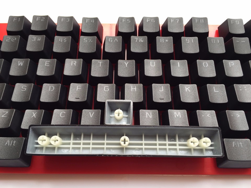 Стабилизаторы представляют из себя специальную систему, которая обеспечивает срабатывание длинных клавиш вне зависимости от точки нажатия. От её качества зависит равномерность хода таких клавиш как Space, BackSpace, Shift, Enter, + (NumPad), 0 (NumPad) и Enter (NumPad). Существует всего два оригинальных типа стабилизаторов, разработанных компаниями Costar и Cherry, но помимо них на рынке можно встретить массу более дешевых аналогов, производимых на территории Китая. Costar. Стабилизаторы Costar состоят из металлических клипс, металлического прута и пластмассовых крестовин. Клипсы устанавливаются на пластину, затем на них устанавливается прут, который вдевается в крестовины, которые, в свою очередь, вставляются в клавишу. Система от Costar полностью открыта и легко поддается ремонту в случае возникновения неполадок. Такие стабилизаторы принято смазывать силиконовой смазкой. Во-первых, нажатие станет более плавным, во-вторых – смазка позволит избежать неприятных звуков и скрипов при использовании. Плюсом стабилизаторов Costar обычно считается более приятные "ощущения" при нажатии по сравнению с Cherry. Минусы гораздо более осязаемые: во-первых, процесс снятия и установки кейкапа значительно более сложный, чем в случае с Cherry, во-вторых, без смазки при нажатии на клавишу могут издаваться неприятные звуки и скрипы. Cherry. Принцип работы стабилизаторов Cherry схож со стабилизаторами Costar, но главное различие заключается в том, что все части "спрятаны" под корпусом, поэтому при снятии клавиши сам механизм стабилизатора остается нетронутым. Основное преимущество стабилизаторов Cherry заключается в легкости снятия клавиши, клавиша снимается так же легко, как и с обычного переключателя. Минус заключается в том, что меняются ощущения при использовании клавиш с стабилизаторами: во-первых при отпускании клавиши удар получается чуть более жестким, а во-вторых, при выжимании клавиши до упора нажатие ощущается менее четко.