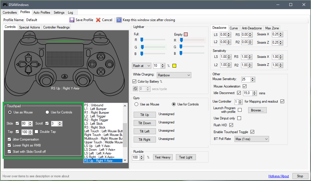Здравствуйте,объясните как в DS4.2 убрать с тачпада мышь и поставить свои кнопки через DS4Windows?