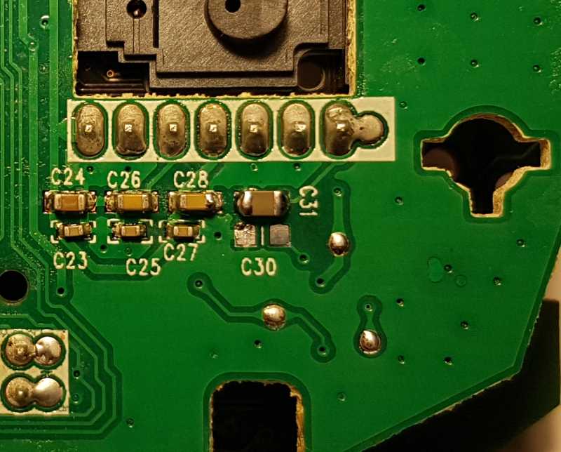 Вместо C30 и C31 я поставил один конденсатор на 0,1 мкФ в корпусе 0805 — просто потому, что у меня были только они. Примерив самые маленькие танталовые на 4,7 мкФ и убедившись, что они не и не помещаются на плате по высоте и не дают заметного ослабления писка, вместо них я поставил на верхней стороне электролит на 10 мкФ, также обнаруженный в запасниках. Эффект не заставил себя ждать: размах пульсаций уменьшился до 60—80 мВ, а писк можно было расслышать только поднеся ухо вплотную к мышке. Электролитический конденсатор припаивается к выводам 9 и 11 датчика и удобно размещается вдоль него — надо только расположить его под небольшим углом, чтобы механизм колесика в него не упирался.