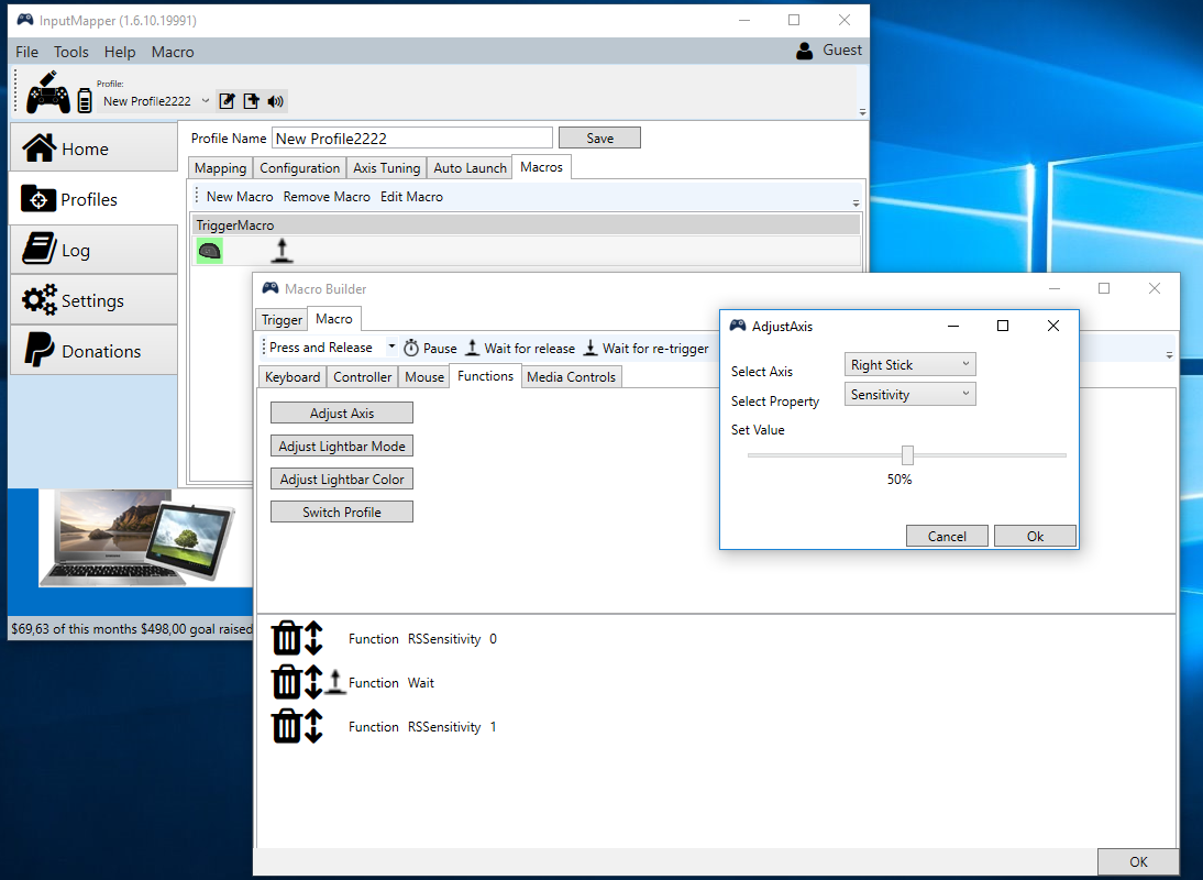 Он работает но почему то когда отклоняешь стик по одной из осей чувствительность сама произвольно возвращается к 100% Хотя я кнопку макроса не отпускал. На видео наглядно видно как сенса уходит в 100% как только я отклоняю стик влево. Причем иногда макрос работает нормально но стоит задействовать второй стик и он перестает работать по какой то из осей. Хочу просто понять проблема локальная или это у всех.