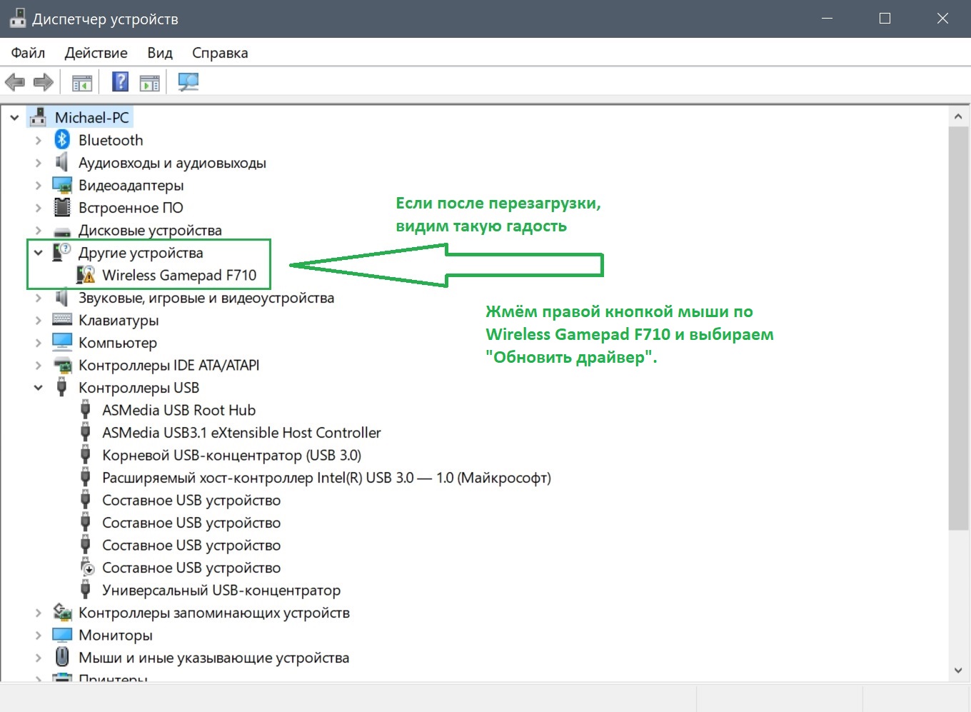 Добавлено спустя 31 минуту 54 секунды: Попробовал воспроизвести твой сценарий: Хуан геймпад по Bluetooth F710 по дефолту в режиме XInput все драйвера тоже по дефолту. Никаких LGS не ставил. Винда десятка, RS4, 17134.5. Что имеем. Всё прекрасно работает до первой перезагрузки. После перезагрузки, свисток F710 отваливается (висит в диспетчере устройств с жёлтым треугольником). Соответственно, система F710 не видит. После того, как свисток F710 передёргиваешь в порту USB, всё опять работает.