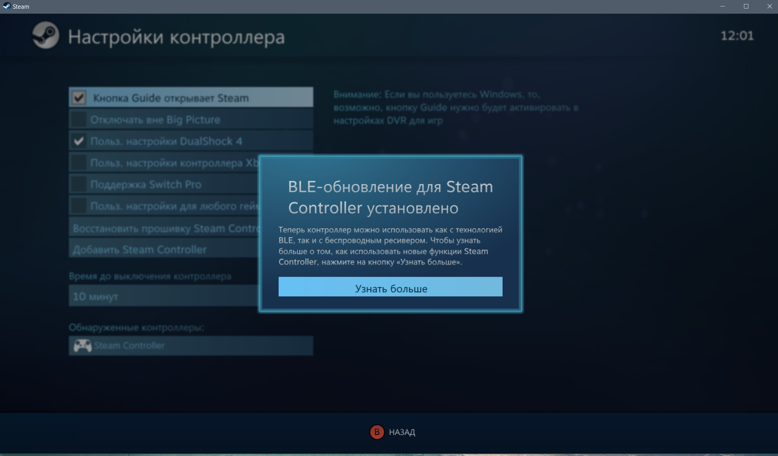 Выпущена новая версия прошивки Steam Controller с поддержкой Bluetooth. В прошивку добавлен второй слот для сопряжения по Bluetooth и добавлены комбинации кнопок для переключения слотов в режимах Bluetooth и беспроводного приемника. Чтобы выбрать второе устройство, к которому вы хотите подключиться, есть две комбинации кнопок: Back+Steam в режиме беспроводного приемника и Start+Steam в режиме Bluetooth. Т.е. для переключения между Bluetooth устройствами, на выключенном геймпаде, зажимаем Start, затем нажимаем Steam button, геймпад пикает и подключается к первому Bluetooth устройству. Если нужно выбрать второе Bluetooth устройство, при следующем включении геймпада, опять зажимаем Start и Steam button и.т.д.