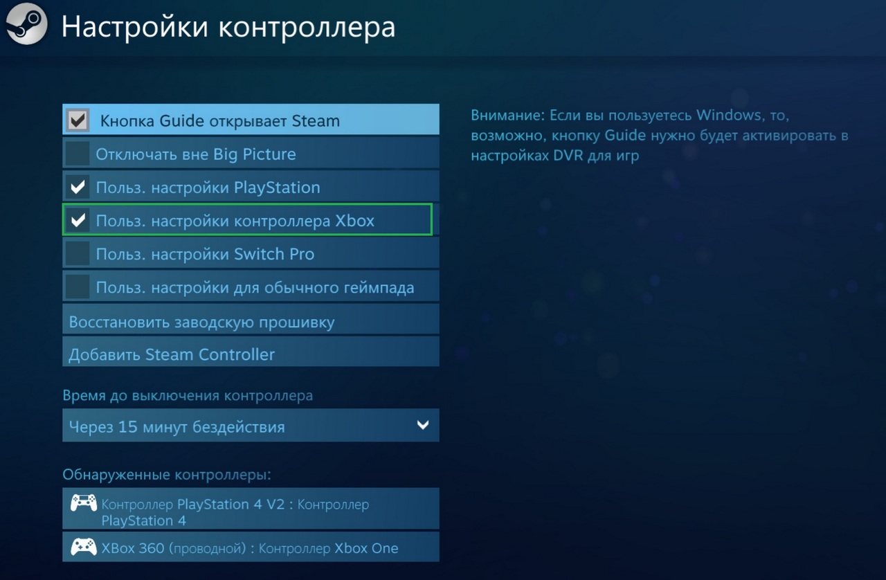 Steam, так же как и другие эмуляторы, представляет твой геймпад игре, как проводной XBox360 контроллер.