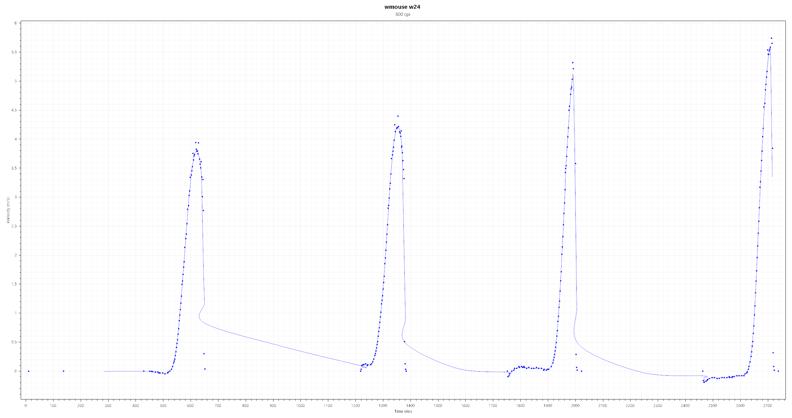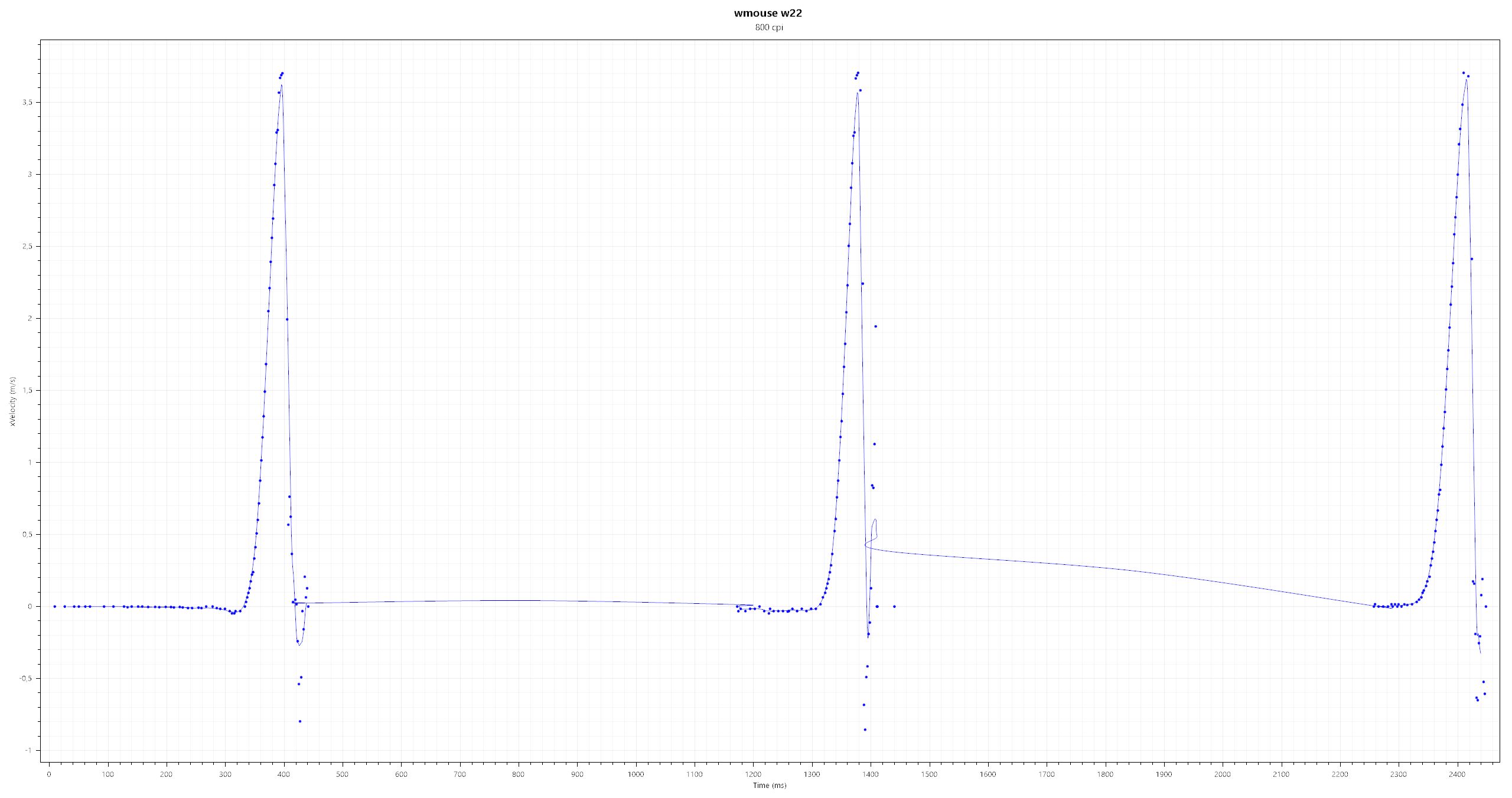 У меня недавно был заказчик на w-mouse с сенсором 3090. вот у него было требование максимальной скорости больше 1.5м/с дело в том что чисто программно, в силу некоторых причин, в w-mouse на 3080-3090 скорость была ограничена 1.8м/с Но Walkie, написал специальные так сказать прошивки для 3090 в которых скорость ограничивается на 3.5м/с. что мы и видим на графике.