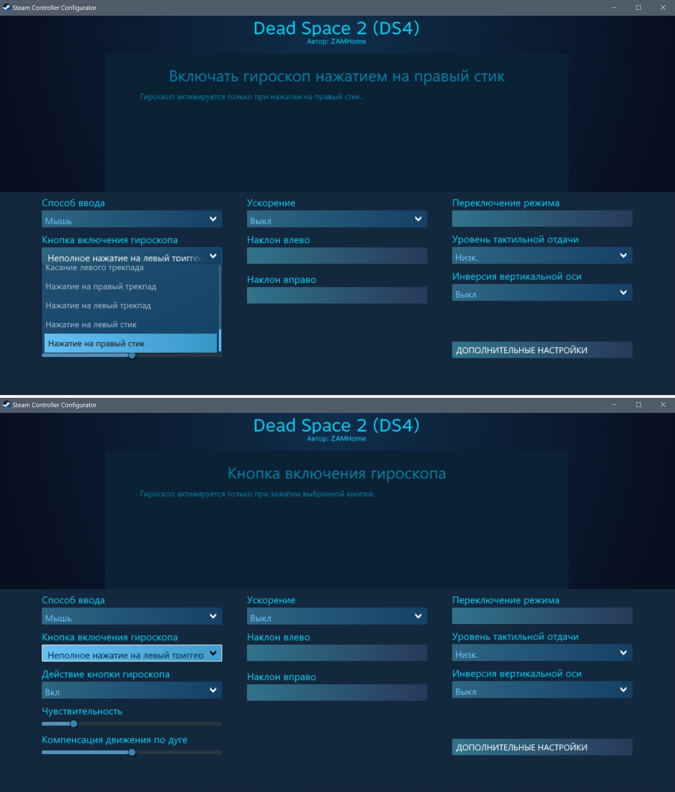 Jameson, где там? В Steam или в играх с нативной поддержкой? 1. В Steam эмулируется XBox геймпад со всеми вытекающими обозначениями кнопок. Гироскоп в играх можно настроить для доцеливания силами Steam (управление вращением камеры или прицел перекидываются на гироскоп, с активацией нажатием левого курка геймпада или касанием тача). Для подсветки можно просто выбрать свой цвет. В играх, с эмуляцией через Steam, сценарии с использованием подсвети не настраиваются.